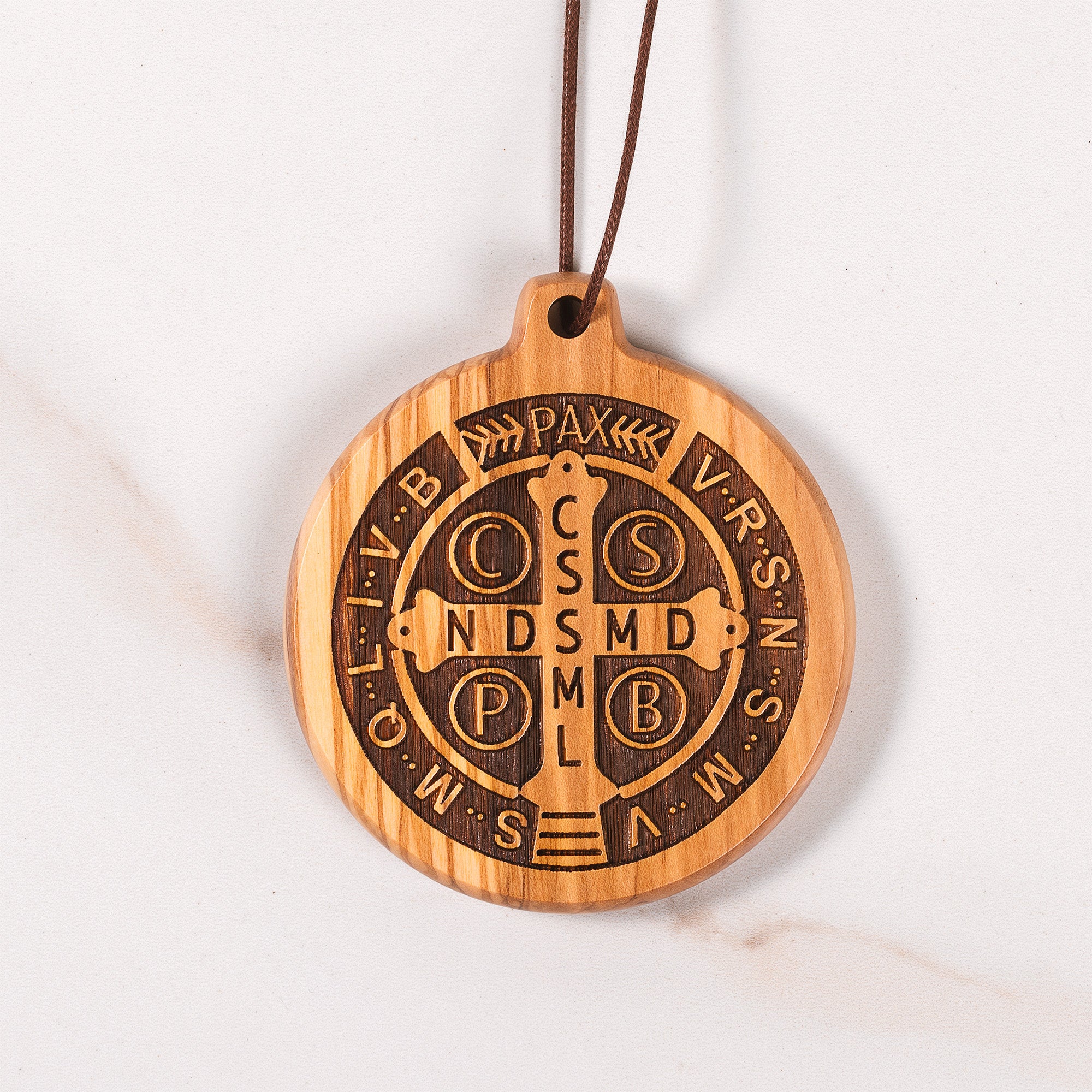 This Corded Olive Wood St. Benedict medallion showcases a unique, laser-cut olive wood St. Benedict Jubilee Medal on a brown cord. The perfect home blessing. Crafted in Italy, it can be hung in any space for blessing and protection.