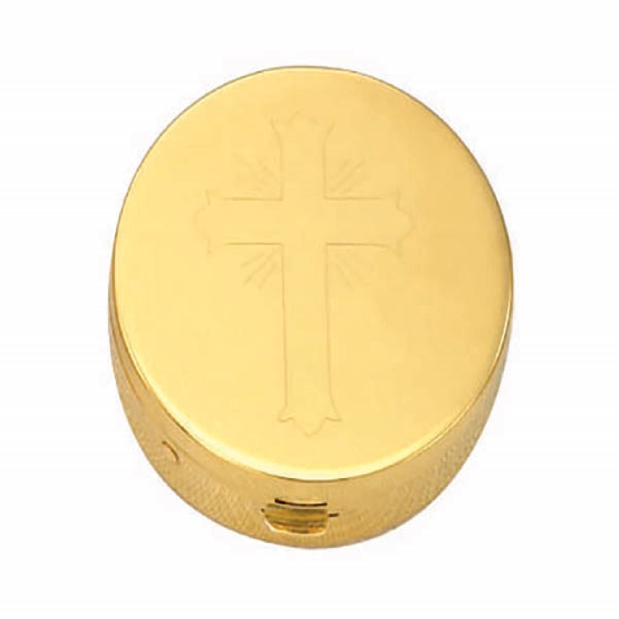 This 24 KT gold plated pyx bears a light engraving of the Cross with a classic sunburst design. It is highly polished on the outside and matte (satin) finished on the inside. Reverently and securely transport the Eucharist to those in need.