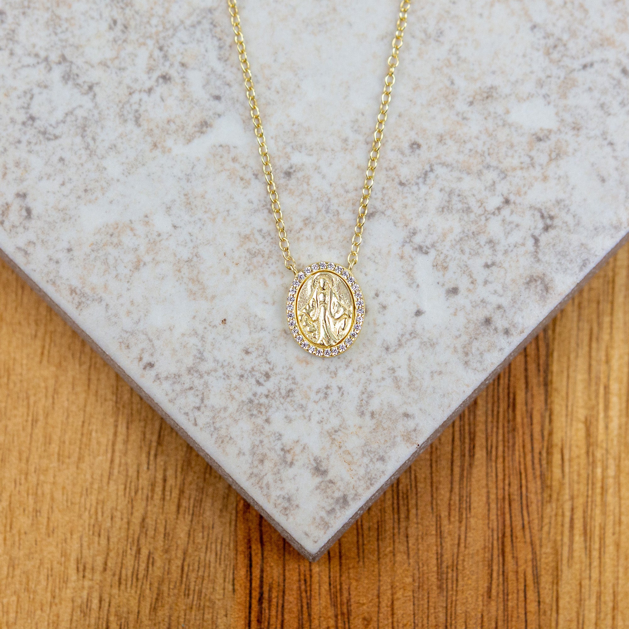 This Dainty Shimmer Miraculous Medal Necklace uniquely blends faith and fashion. Featuring a petite Miraculous Medal adorned with cubic zirconia accents in gold over sterling silver, it hangs from a delicate 16" curb chain with a 2" extender. Ideal for layering or as a standalone piece, this necklace makes a cherished gift of devotion.