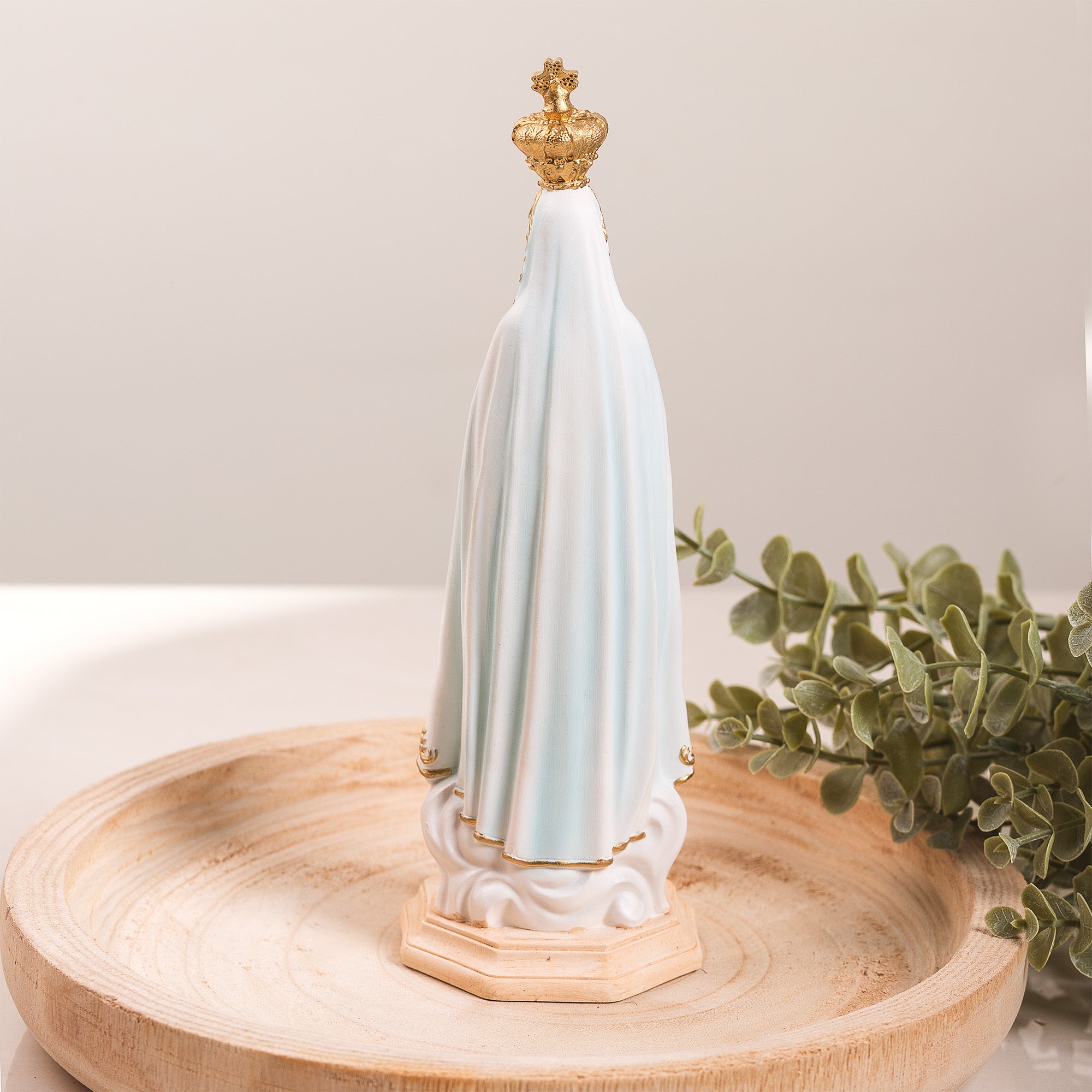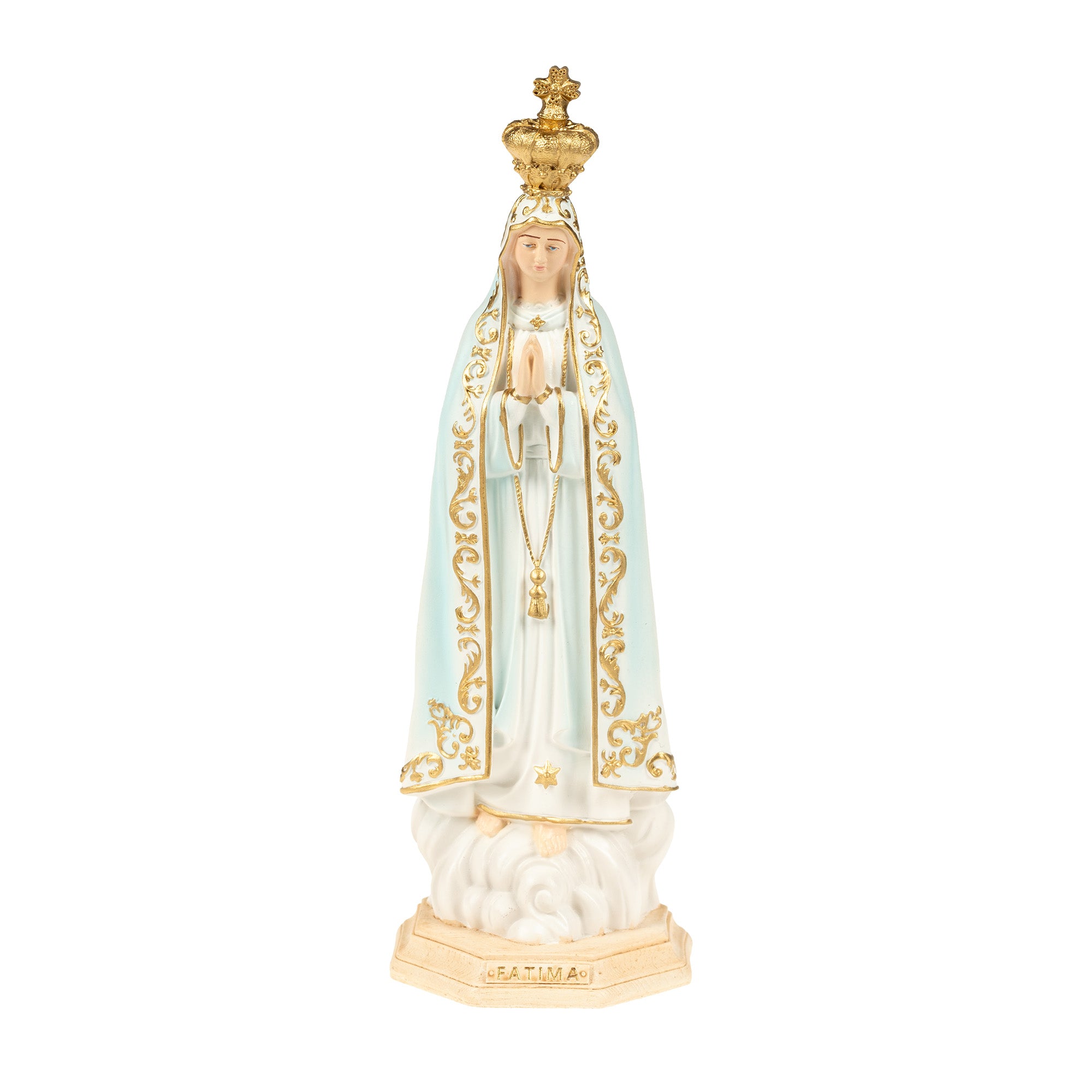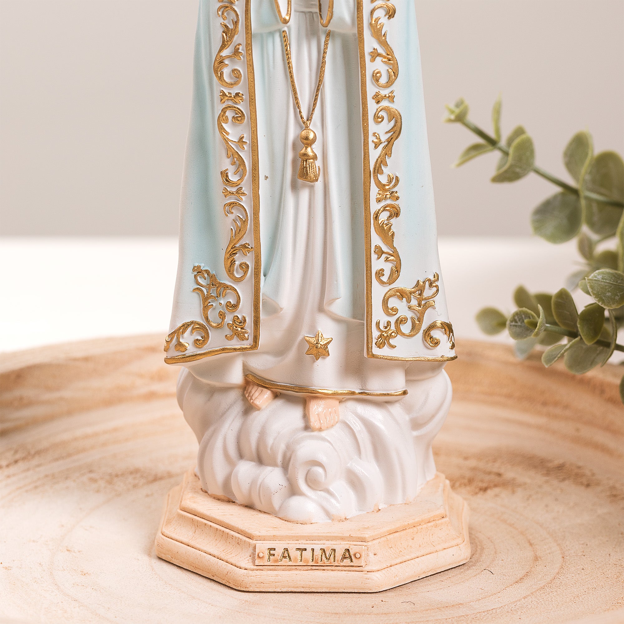This 7.8" Our Lady of Fatima statue is crafted with delicate and graceful lines in serene pastel tones, highlighted by a brilliant golden crown. Made in Italy from resin, it offers an elegant touch to any space and serves as a meaningful devotional gift.