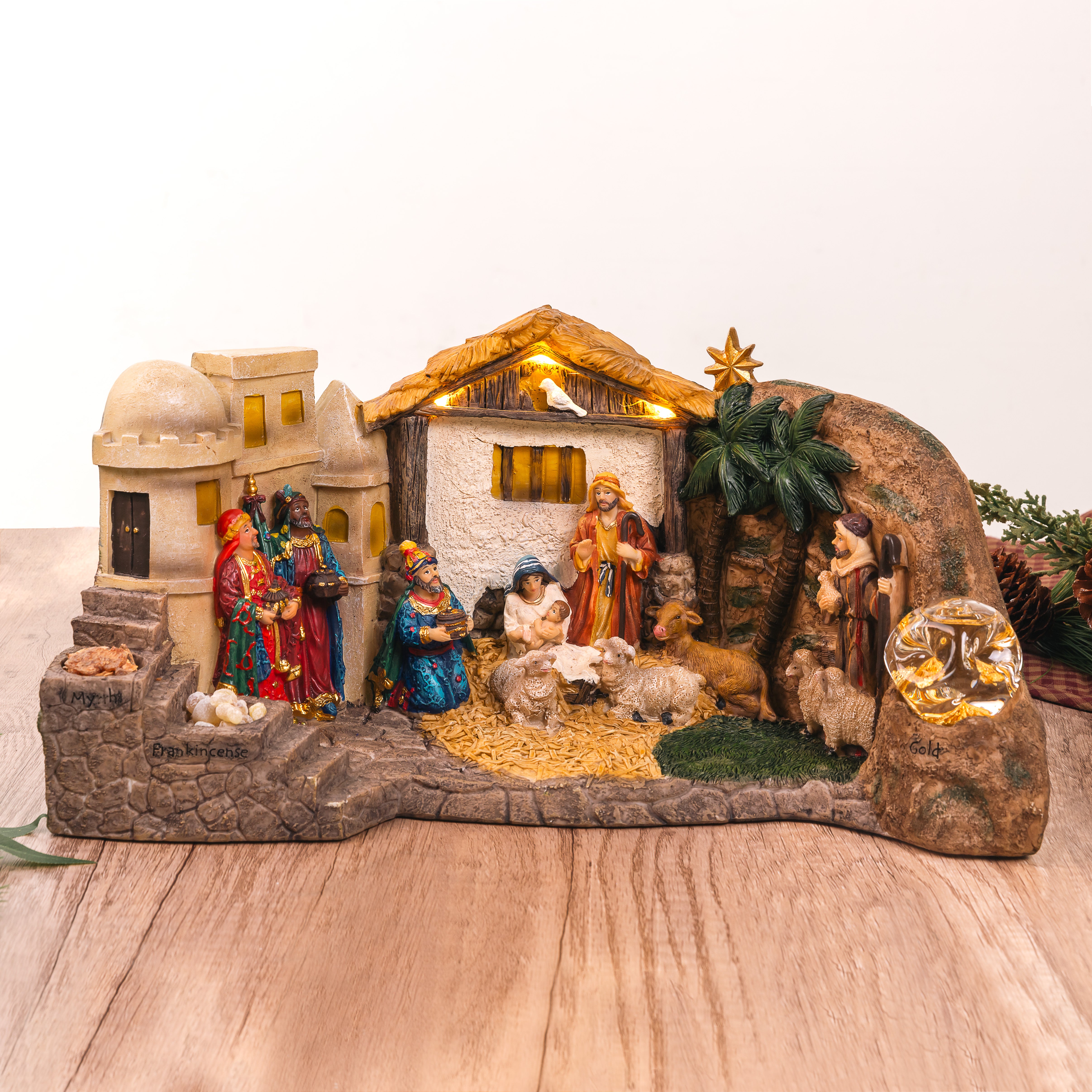 This Deluxe Lighted Panorama Nativity Scene is a stunning display featuring hand-painted resin figures, including the three kings with 23k Gold and authentic Frankincense and Myrrh. Illuminated by tiny LED lights, it showcases a Bethlehem field mural with shepherds and a heavenly angel on the reverse. Measuring 7.5" tall by 12" wide, this captivating scene is perfect for dual-sided viewing.