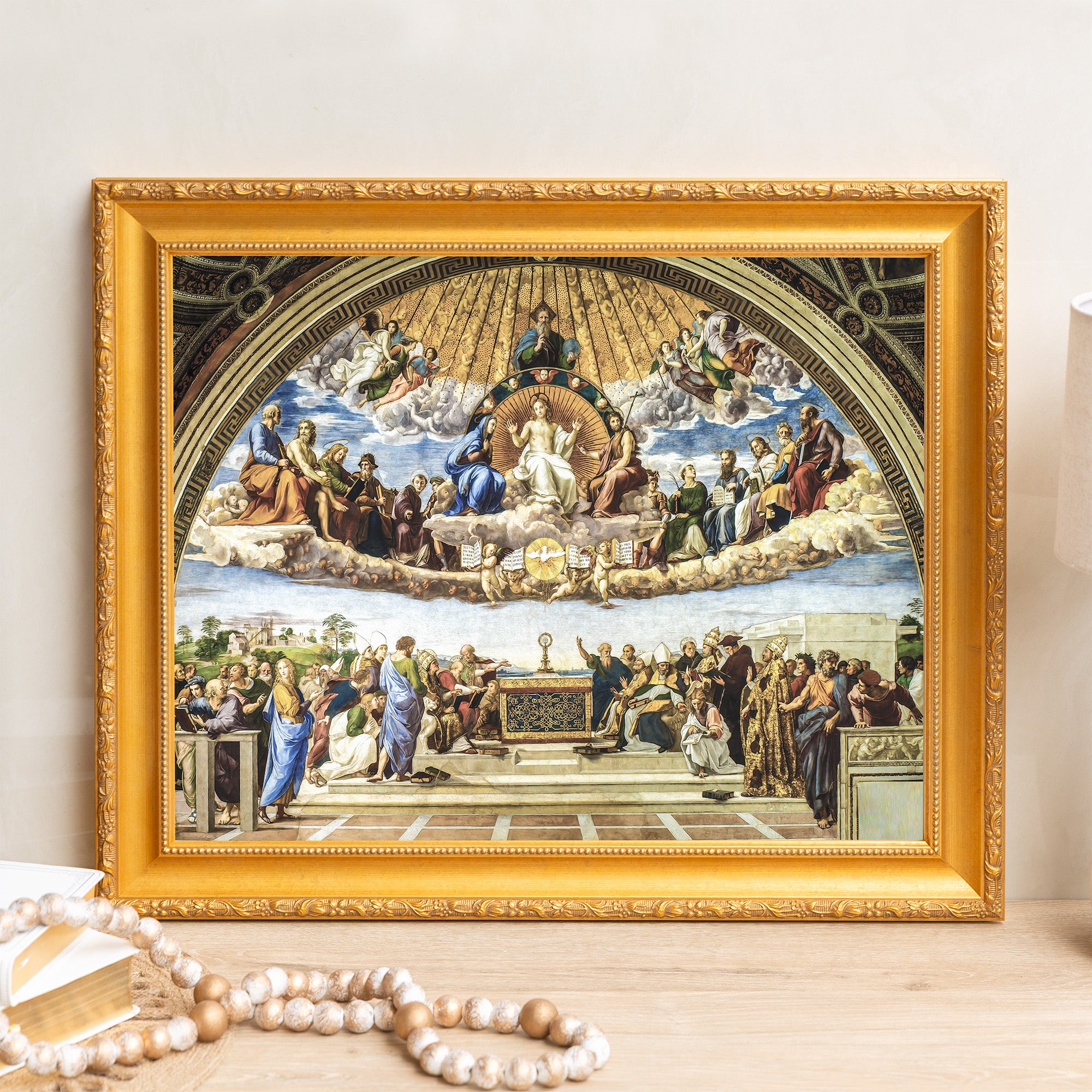 The Disputation of the Holy Sacrament Framed Canvas, part of the Sacred Signature Collection, beautifully showcases Raphael's masterpiece with gallery-quality printing and hand-crafted gold frames. Exclusively available at The Catholic Company, this devotional artwork embodies faith's beauty and timelessness, serving as meaningful home or parish decor or a cherished gift crafted in Charlotte, NC.