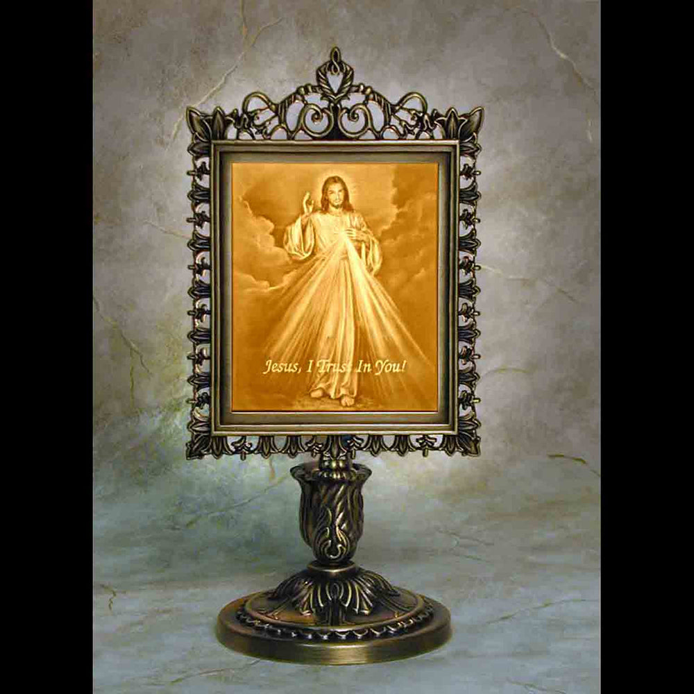 Illuminate your sacred spaces with the Divine Mercy Accent Lamp, featuring a charming Victorian design with antique bronze finish. This expertly crafted lithophane art piece displays a warm Divine Mercy image when backlit, offering a soft glow. Made in the USA by a skilled artisan, it includes a bulb and 6' cord for easy setup, making it a perfect home accent or thoughtful gift of faith.
