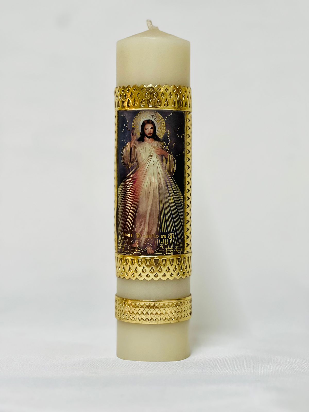 - Ivory pillar candle with gold scrollwork and picture Divine Mercy image