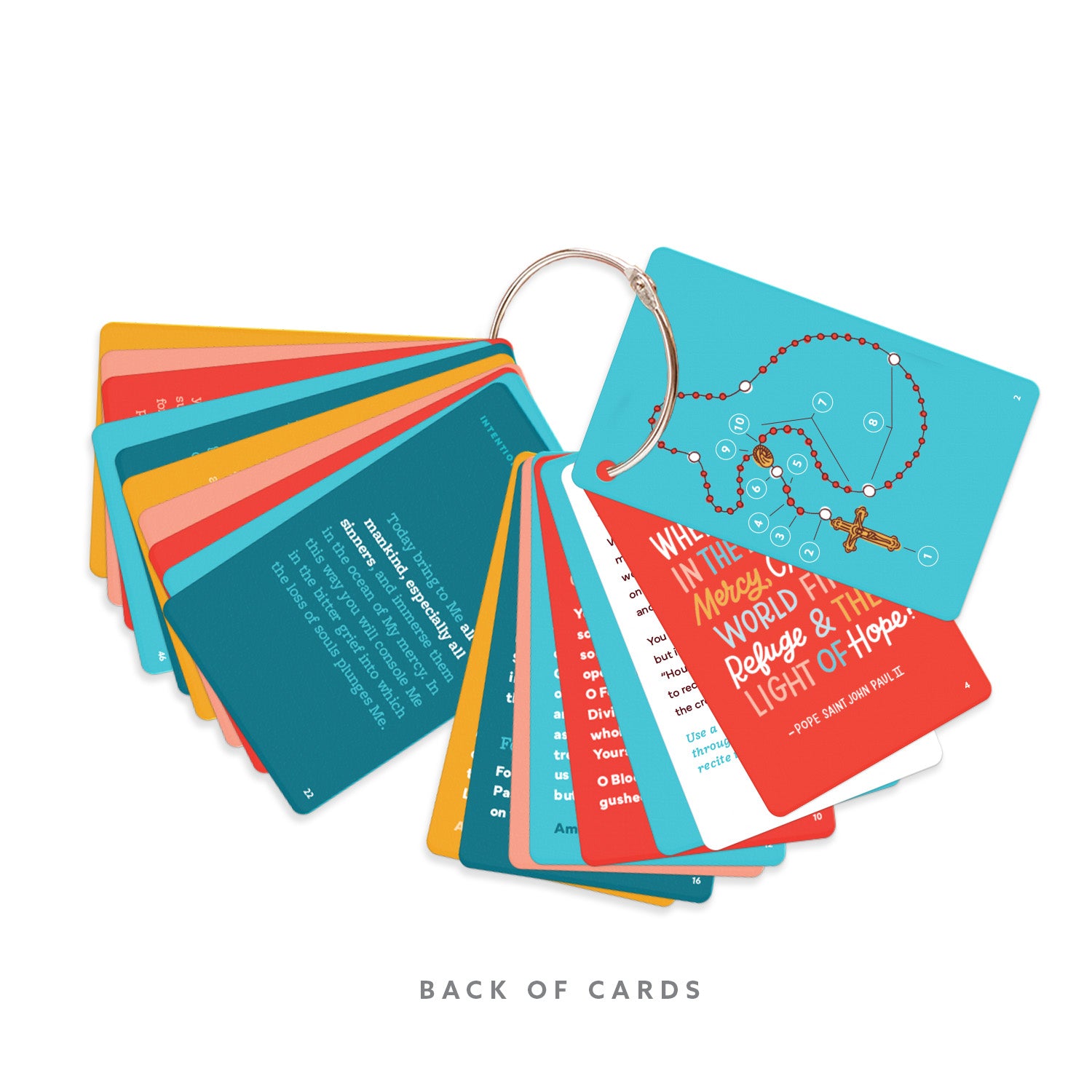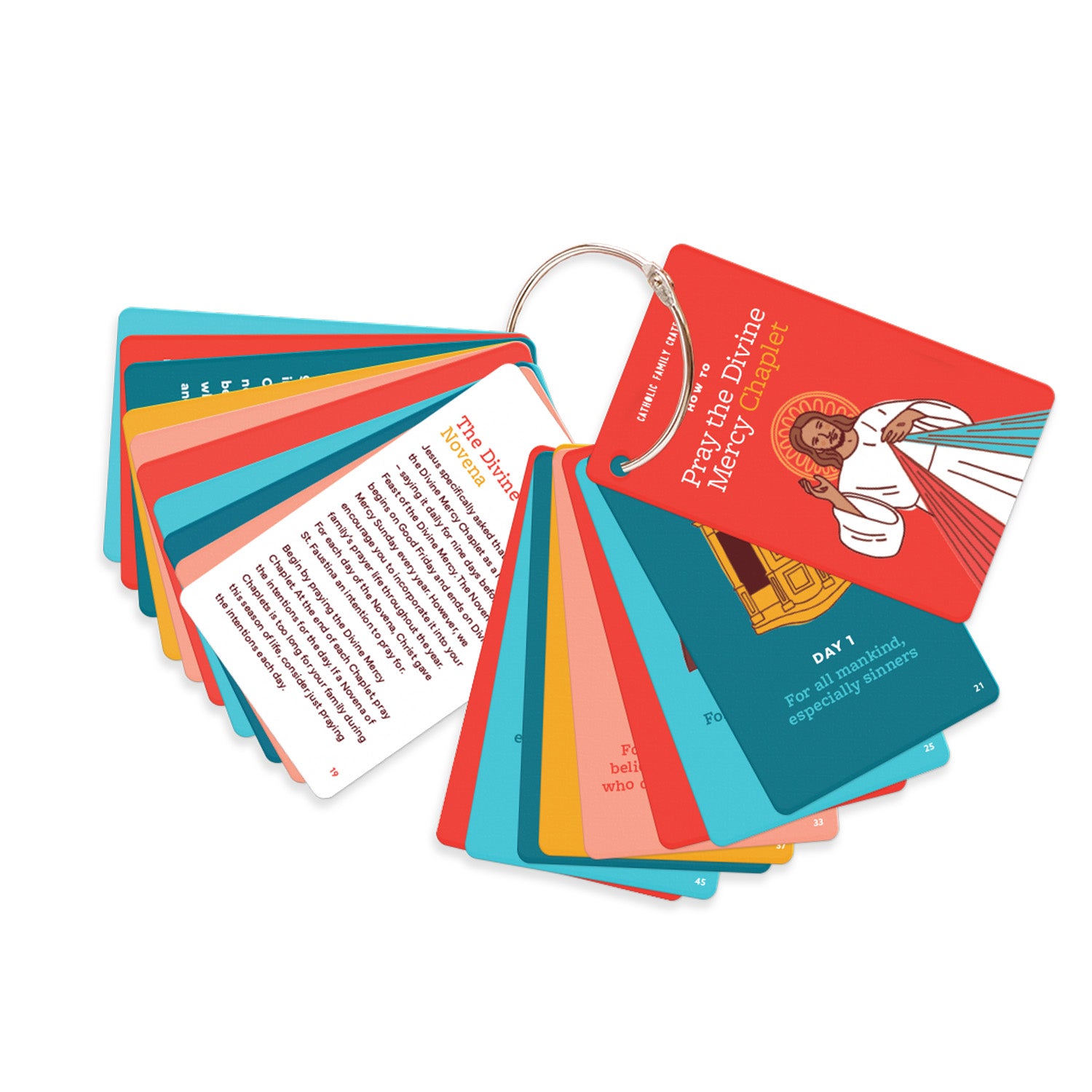 The Divine Mercy Flip Card Ring is a charming and interactive tool designed to engage children in learning Catholic prayers. Featuring 15 brightly illustrated cards with easy-to-read text, it helps kids understand the Divine Mercy Chaplet and Novena. The cards are secured on a metal ring for convenience, making it perfect for individual or family activities. A fun and imaginative gift for Catholic kids.