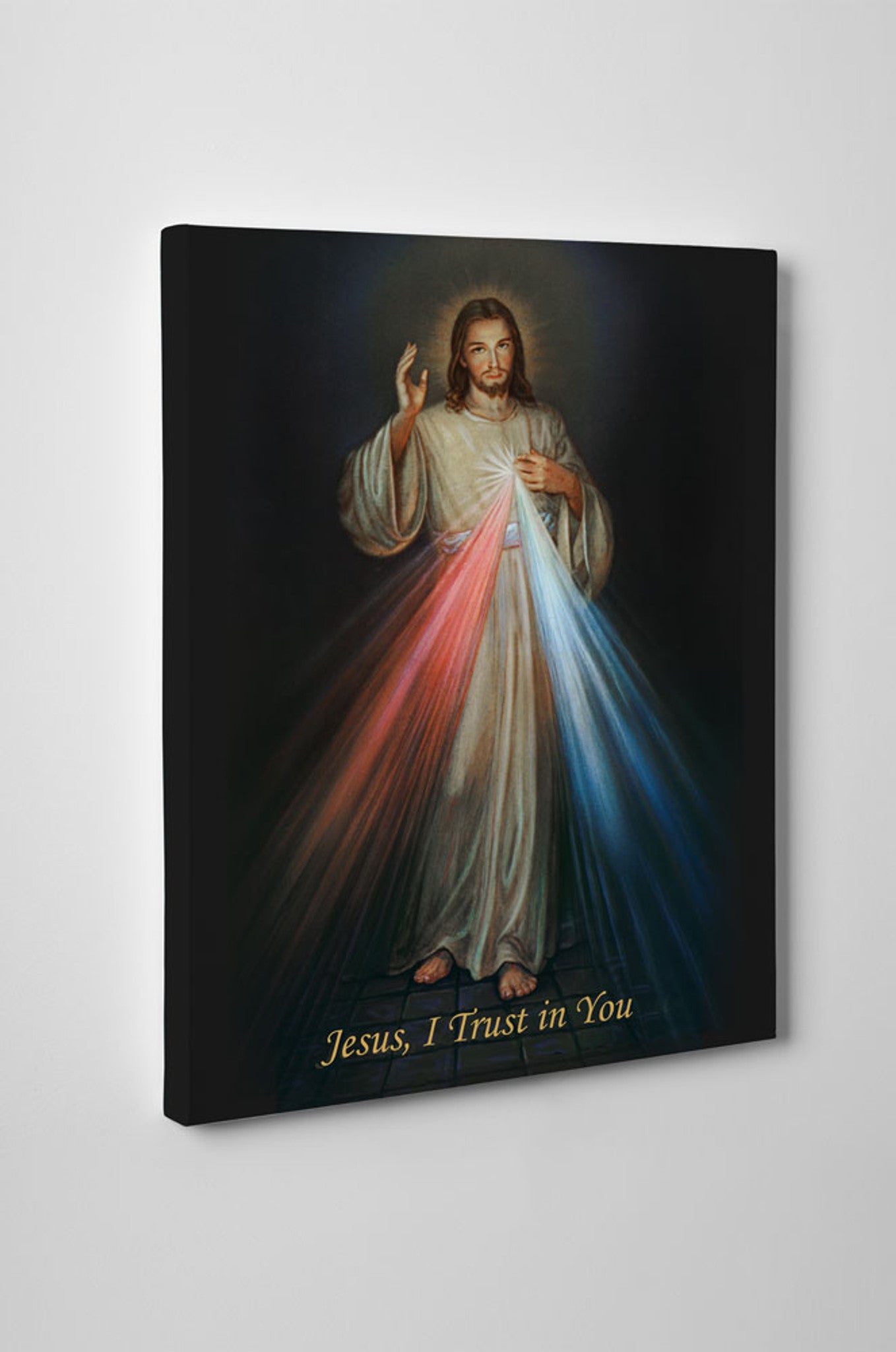 The Divine Mercy Gallery Wrapped Canvas boasts a serene image with vibrant colors and a gold-accented quote, ideal for encouraging devotion in any sacred space. Its satin-matte finish complements the staple-free, ready-to-hang design. Perfectly printed on canvas and wrapped over a wooden frame, it's an elegant addition to your parish, office, or school. Available in various sizes.