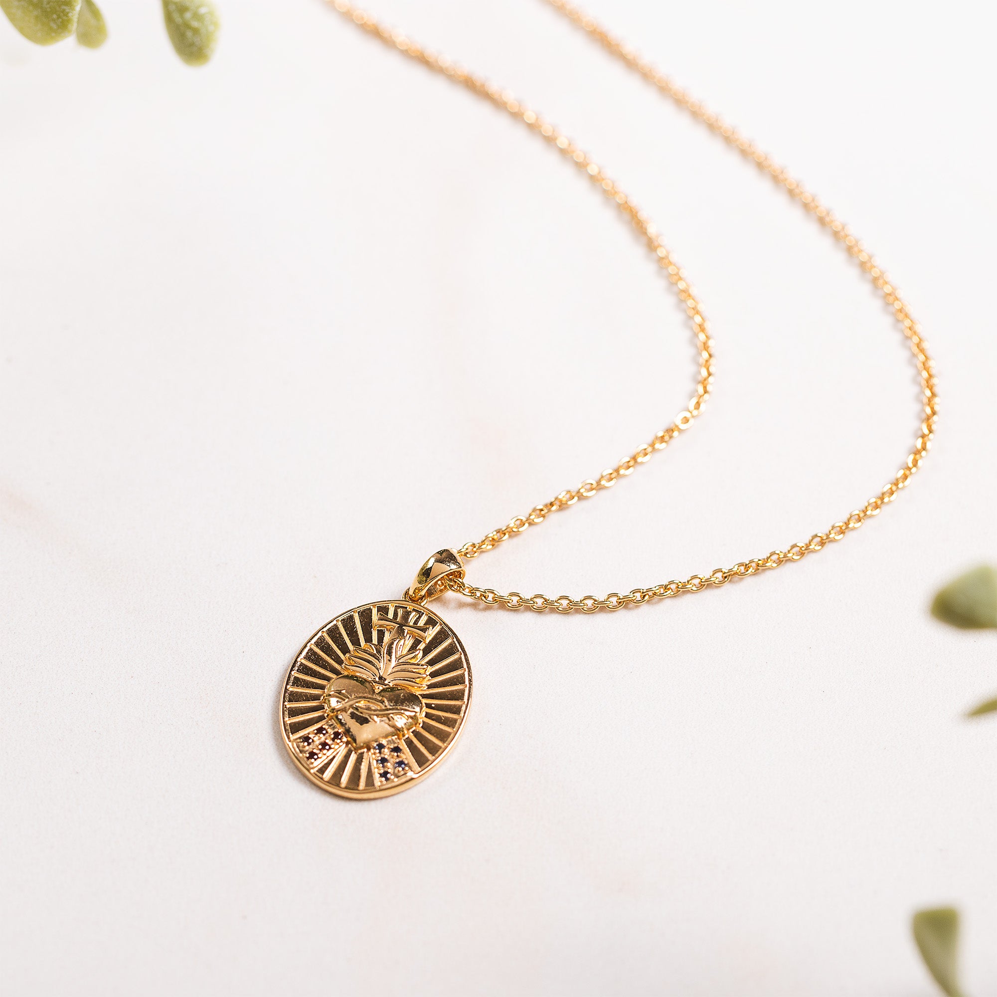 The gorgeous necklace features an oval pendant with an elegant image of the Sacred Heart in the center.