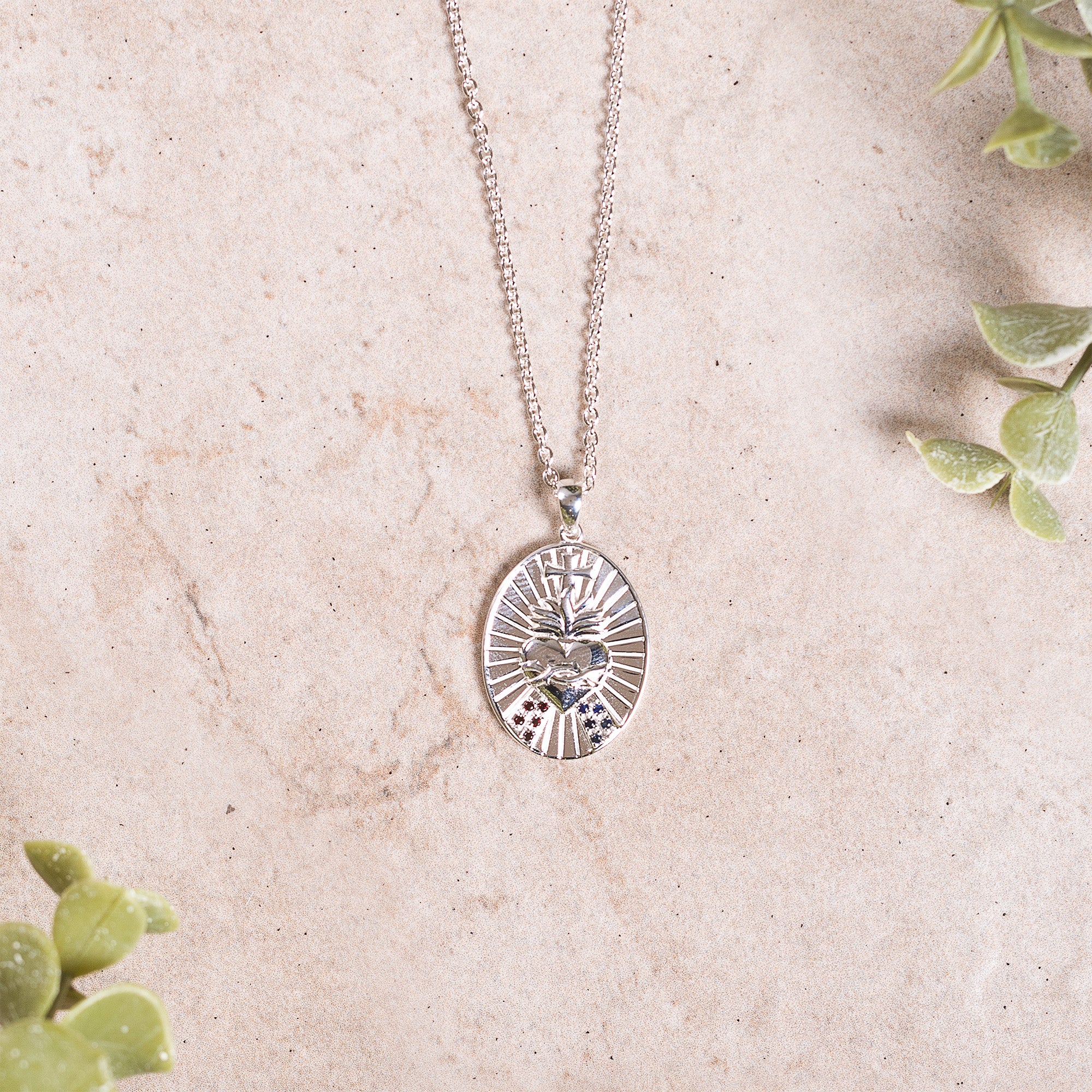 The Divine Mercy & Sacred Heart Necklace is a custom-designed piece exclusively from The Catholic Company. Featuring 5 red garnets and 5 blue sapphires set in sterling silver or gold overlay, this necklace beautifully symbolizes Christ's merciful love. Its elegant design, with an 18" chain and 1" pendant, makes it a cherished devotional accessory and a perfect gift for her.