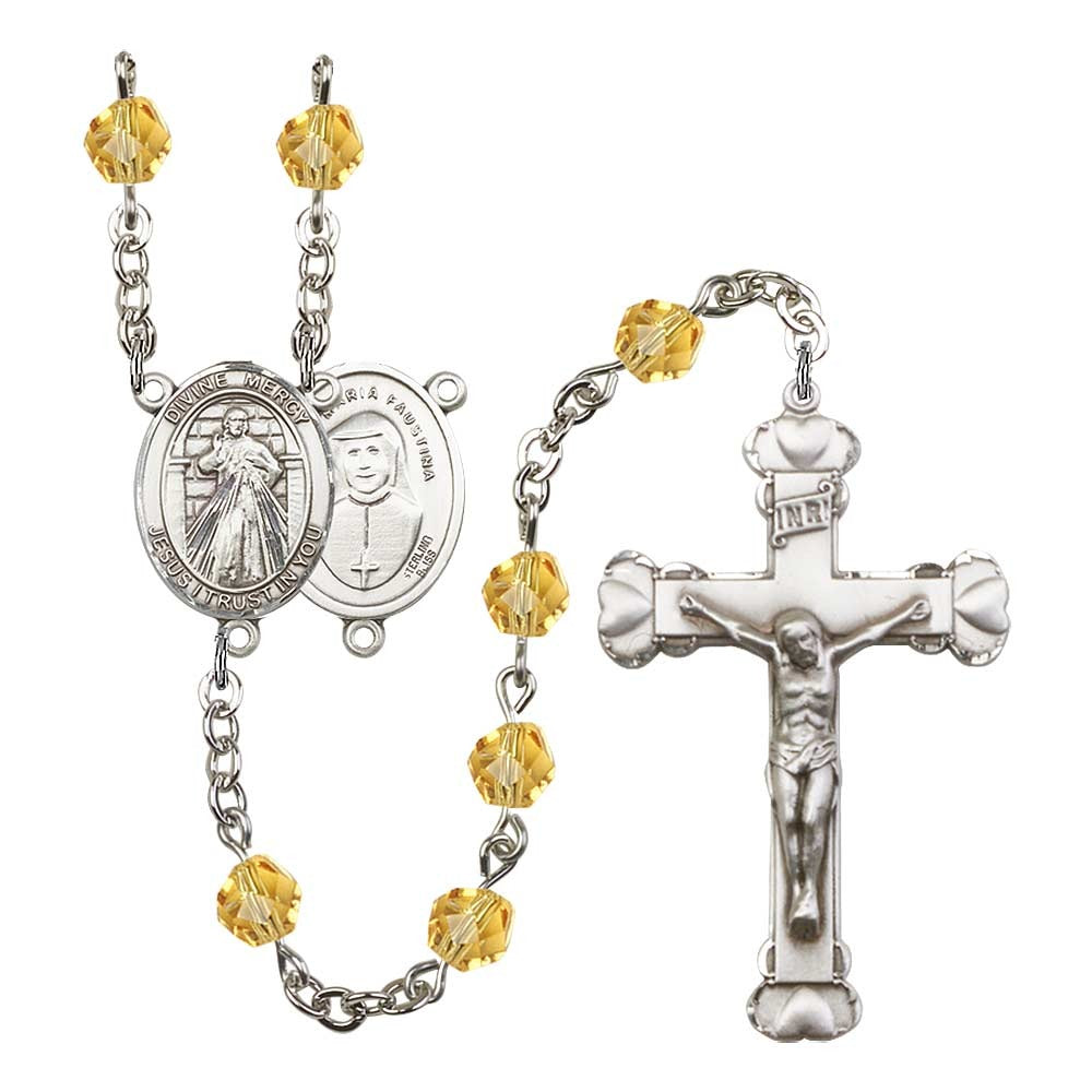 The Divine Mercy Yellow November Rosary is a handcrafted piece made in the U.S.A. by Bliss Manufacturing. It features 6mm yellow Czech fire polished glass beads, perfect for November birthdays with its topaz-like hue. The rosary includes a Divine Mercy medal centerpiece and a lead-free pewter crucifix, all on a tarnish-resistant rhodium-plated wire, measuring approximately 20 inches in length.