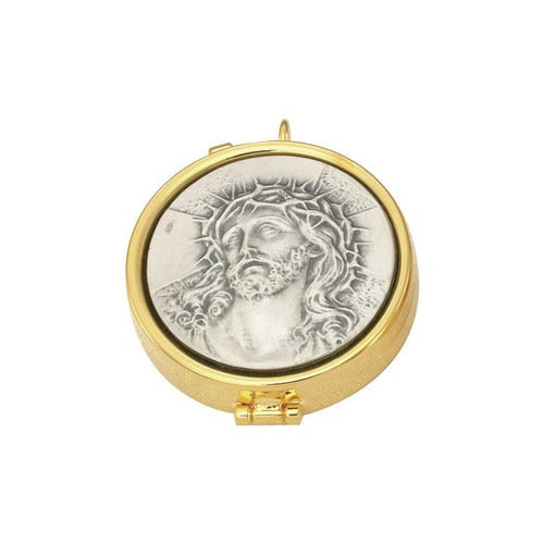 The Ecce Homo Pyx features an evocative image of Christ's head on its oxidized silver lid, showcasing quality craftsmanship. Its 24KT gold-plated exterior and highly polished interior make it both sturdy and stately, perfect for transporting the Holy Eucharist. Measuring 2.13" x 0.63", it holds seven 1.375" diameter hosts. Made in Europe. Returns and Cancellations Subject to Restocking Fees.
