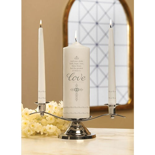 The Faith Hope and Love Wedding Unity Candle Set beautifully commemorates Holy Matrimony with an elegant design. Featuring a pillar and two taper candles enriched with silver embellishments, this set displays 1 Corinthians 13:13. Made from premium paraffin wax, the set comes in a keepsake box, ensuring a lasting memory of the special day. Candle holder not included.