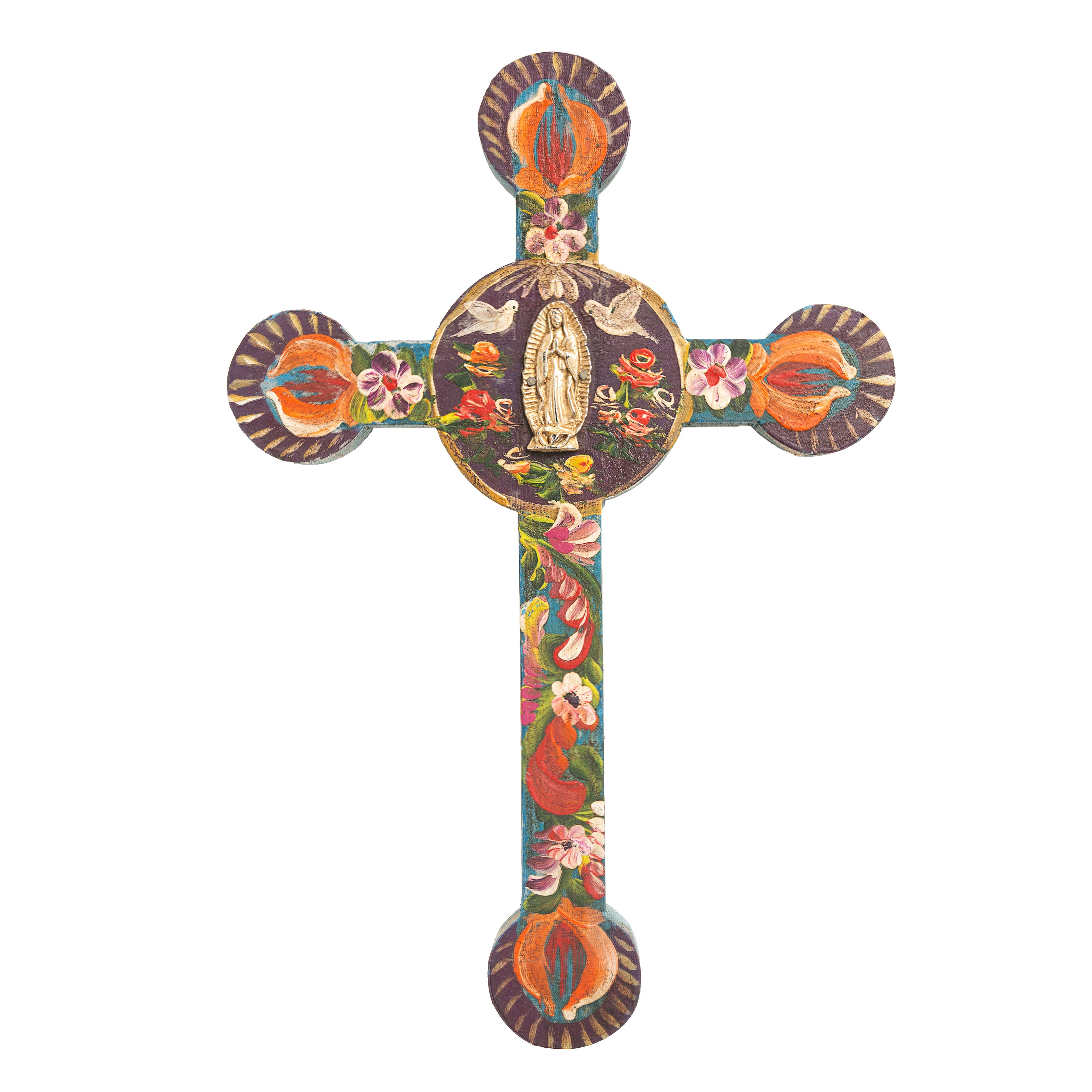 Celebrate your faith with the Flame of Love Our Lady of Guadalupe Wall Cross. Handcrafted in Mexico, this 12" wooden cross is vibrantly decorated with hand-painted designs and a centerpiece of Our Lady of Guadalupe. Its unique design symbolizes love, devotion, and gratitude, making it a meaningful Catholic gift. Each cross is a unique piece of art that honors the Patroness of Mexico and the Americas.