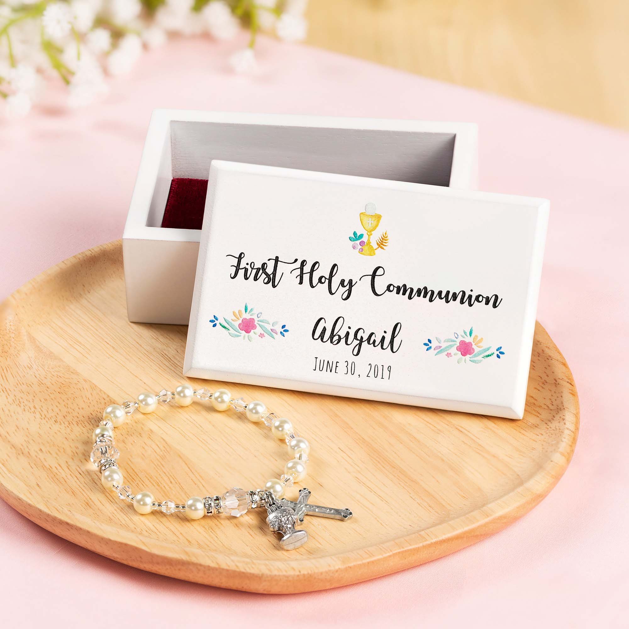 Celebrate her First Holy Communion with a personalized Floral First Communion Box & Chalice Rosary Bracelet. This elegant set includes a delicate bracelet made of classic glass pearls, Swarovski crystals, and silver-lined beads. The personalized white wood keepsake box with floral accents is perfect for storing the bracelet and other treasures, making it a cherished gift of prayer and devotion.