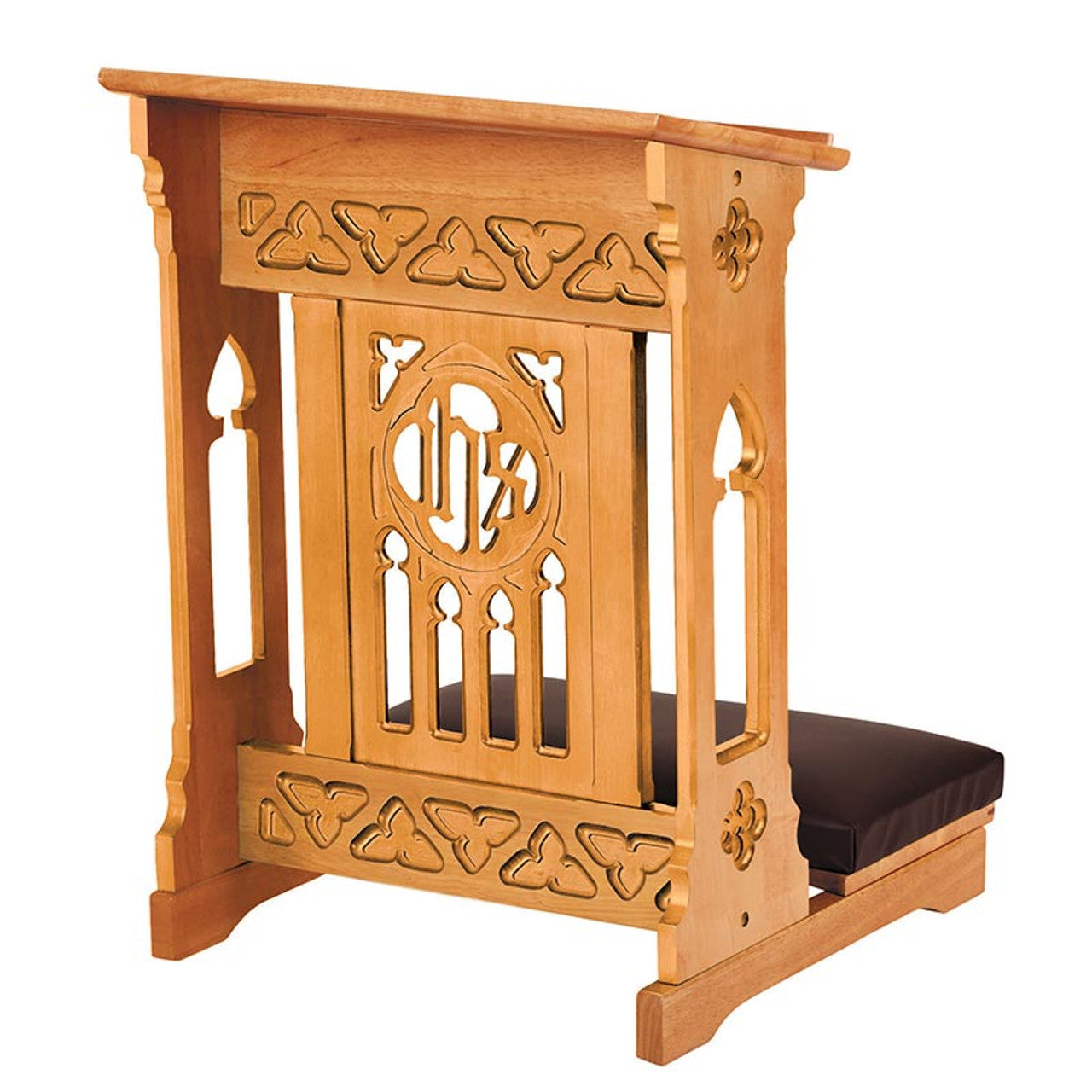 The Florentine Padded Kneeler exudes elegance and reverence with its hand-crafted solid maple construction and oak stain finish. Featuring Gothic architectural detailing and a laser-cut IHS Christogram centerpiece, it offers both beauty and functionality. Complete with a padded burgundy cushion and book ledge, this kneeler is ideal for sanctuaries, chapels, or retreat centers.