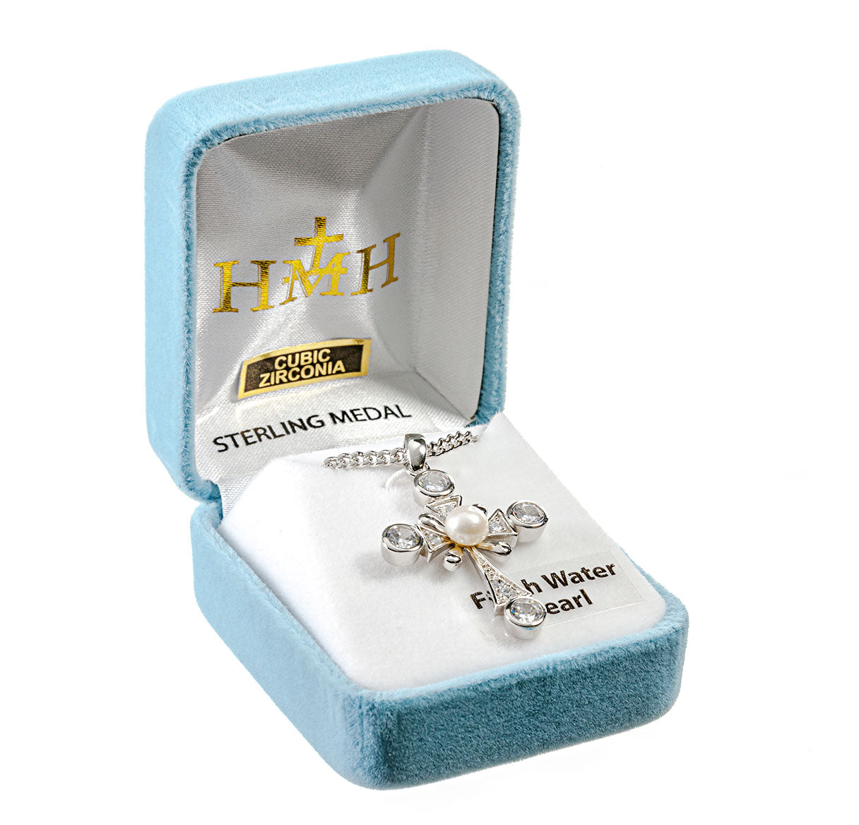 This gorgeous sterling silver cross necklace features a freshwater pearl center and dazzling cubic zirconia gems. Flared triangles with jeweled circle tips create a uniquely-shaped, yet elegant piece of faith jewelry. Pendant floats on a surgical grade stainless steel curb chain. Makes a stunning gift for women of faith for any special occasion. Gift boxed for presentation.
