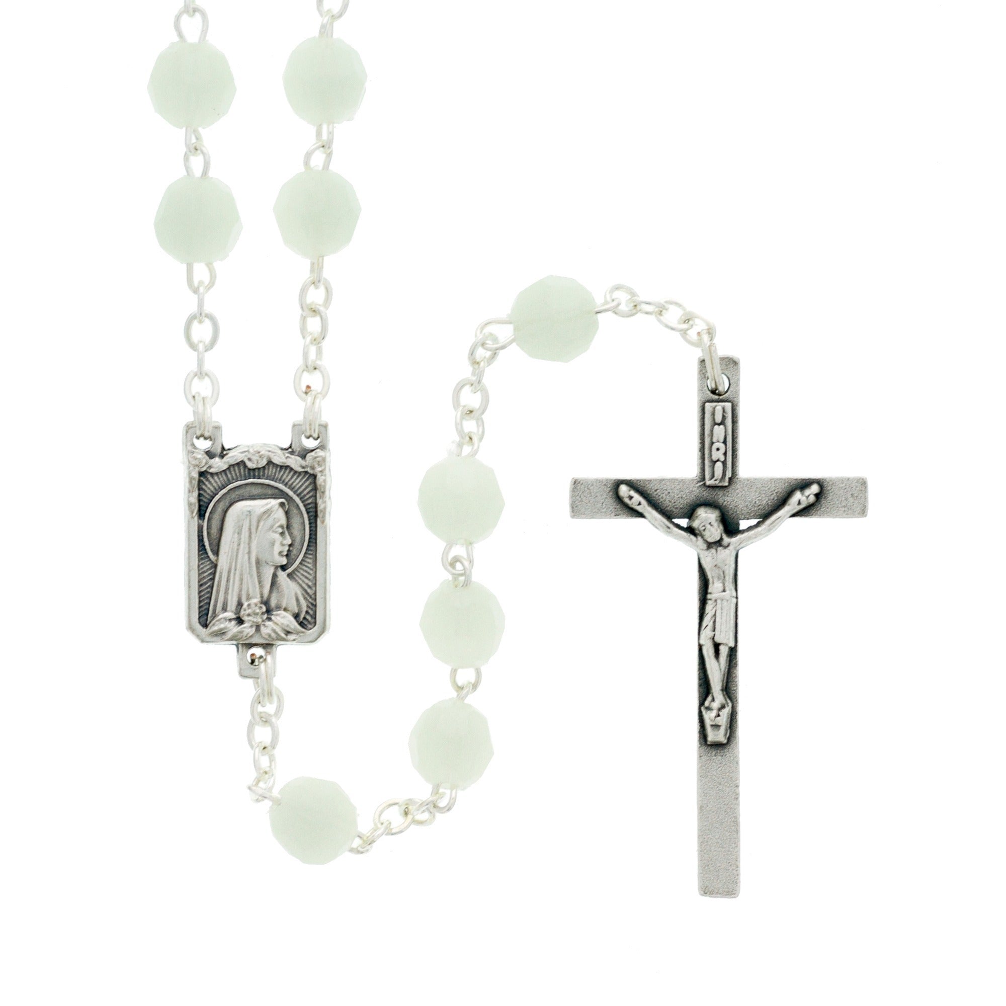 This lovely rosary features glow-in-the-dark beads, which makes it easy to find if you keep one by your bedside and happen to drop it during the night. Has a reverent crucifix and a Marian silhouette centerpiece.