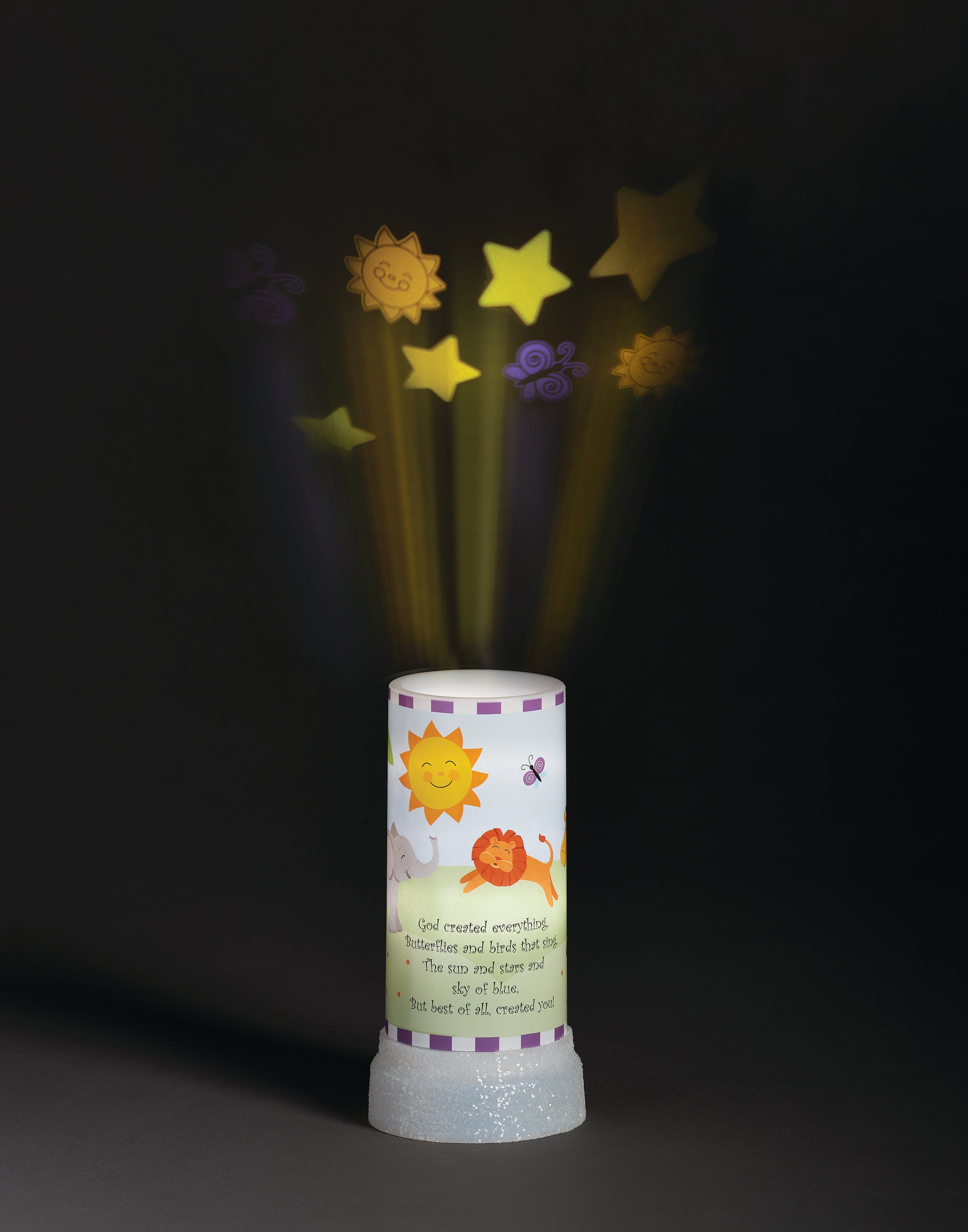 God Created Everything, and this sweet night light will teach and entertain your child while emphasizing the joy of His creations. It features a tube shaped base, decorated by precious and colorful drawings appealing to children. Animals romp through the grass as the sunshine and butterflies smile down on God's handiwork. An artfully scripted poem teaches about God's creation, and through the top of the tube shaped night light, brightly colored images project into the darkness. The sun, stars, and butterflies swirl and rejoice in your child's darkened room, bringing comfort and even providing distraction in the sleepy hours. Perfect Baby Shower, Newborn or Baptism gift. Requires 3 AAA batteries. Batteries not included.