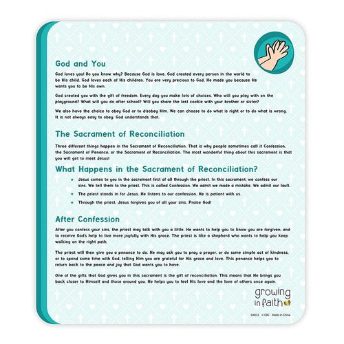 This bingo-like card is a great teaching instrument to make Confession interactive and fun. It includes a Prayer Before Confession and Act of Contrition children can read as they go, as well as step-by-step instructions. Each step is printed in a "window" with a red plastic tab, and children can close the red tab when they have accomplished that step. They hold the card in hand as they go. Wonderful instruction for young kids to take away any fear of the sacrament of Reconciliation.