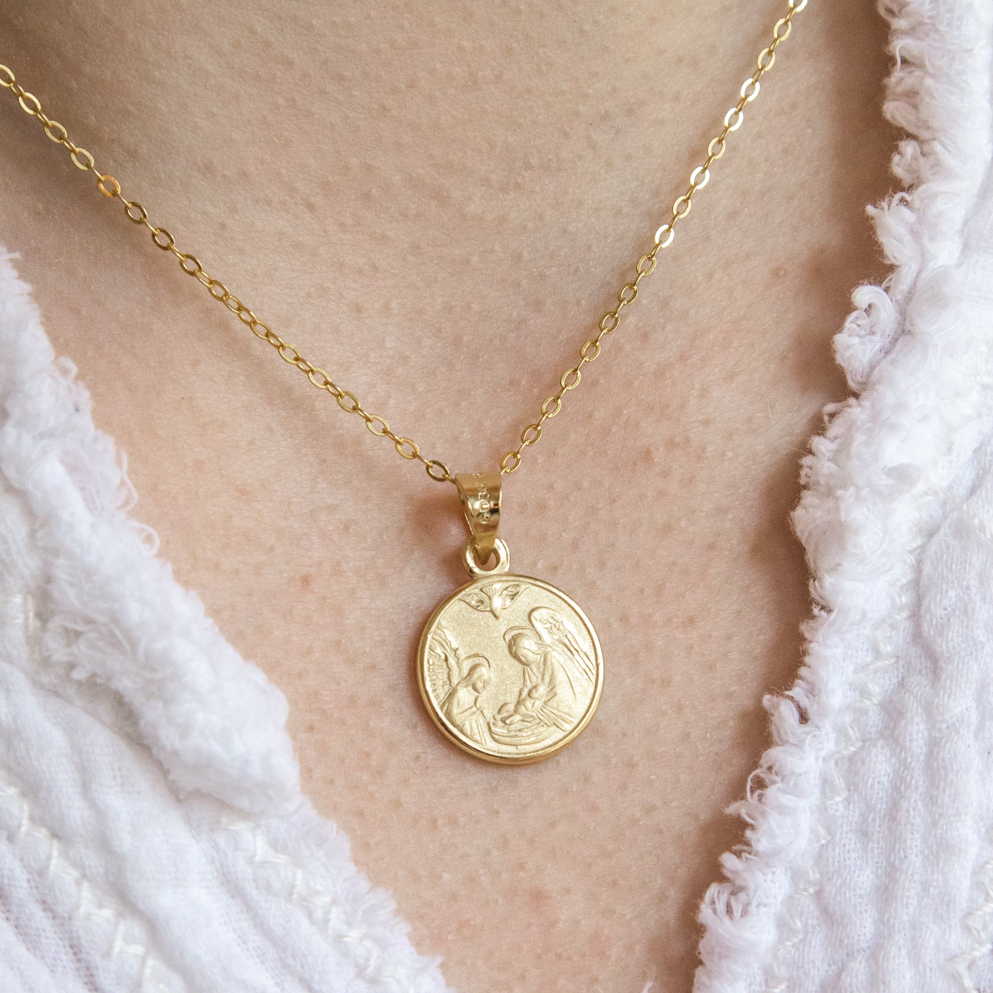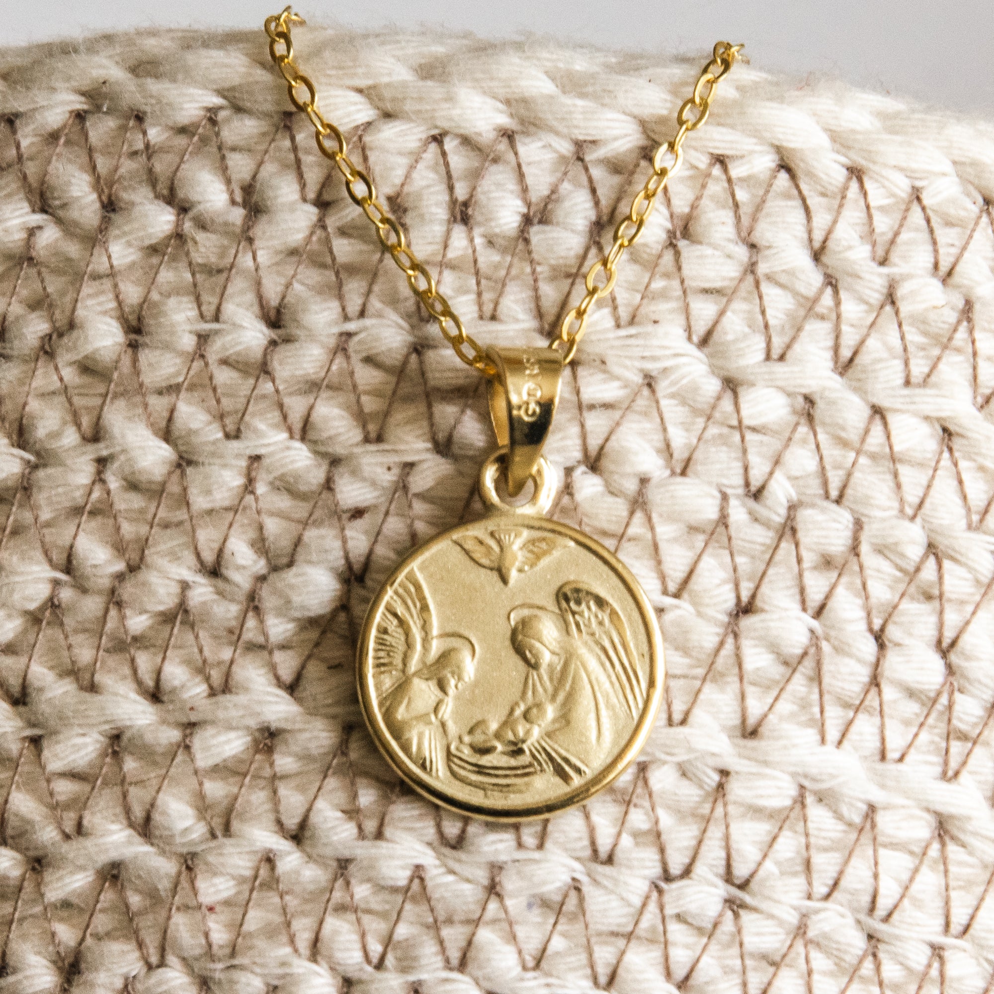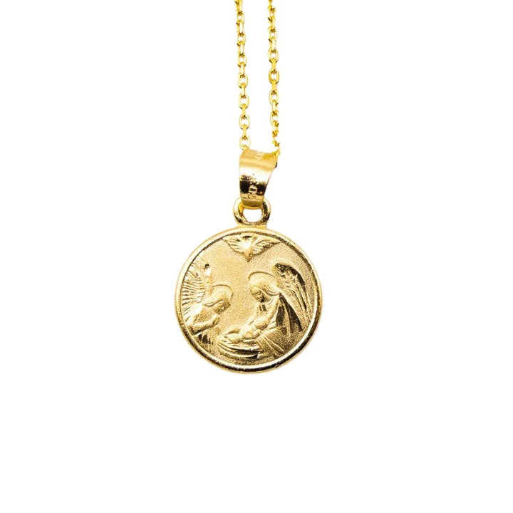 Celebrate new life and the grace of God with this exquisite Gold Baptismal Medal Necklace. Featuring a delicate medal depicting two Angels guarding a baby at the Baptismal font, this beautifully detailed piece serves as a thoughtful keepsake of a child's Sacramental day. With a 16" chain and 2" extender, it makes a cherished gift for any baptism. Made in Mexico.