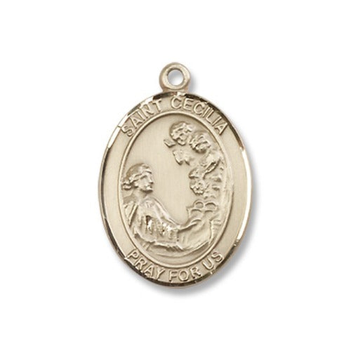14K Gold filled St.Cecilia pendant, comes on a gold plated lite curb chain. The pendant measures 3/4 x 1/2" and comes gift boxed.
