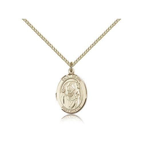 14kt Gold Filled St. David of Wales Pendant on an 18" Gold Filled Lite Curb Chain with clasp. Size: 3/4 x 1/2 inches.