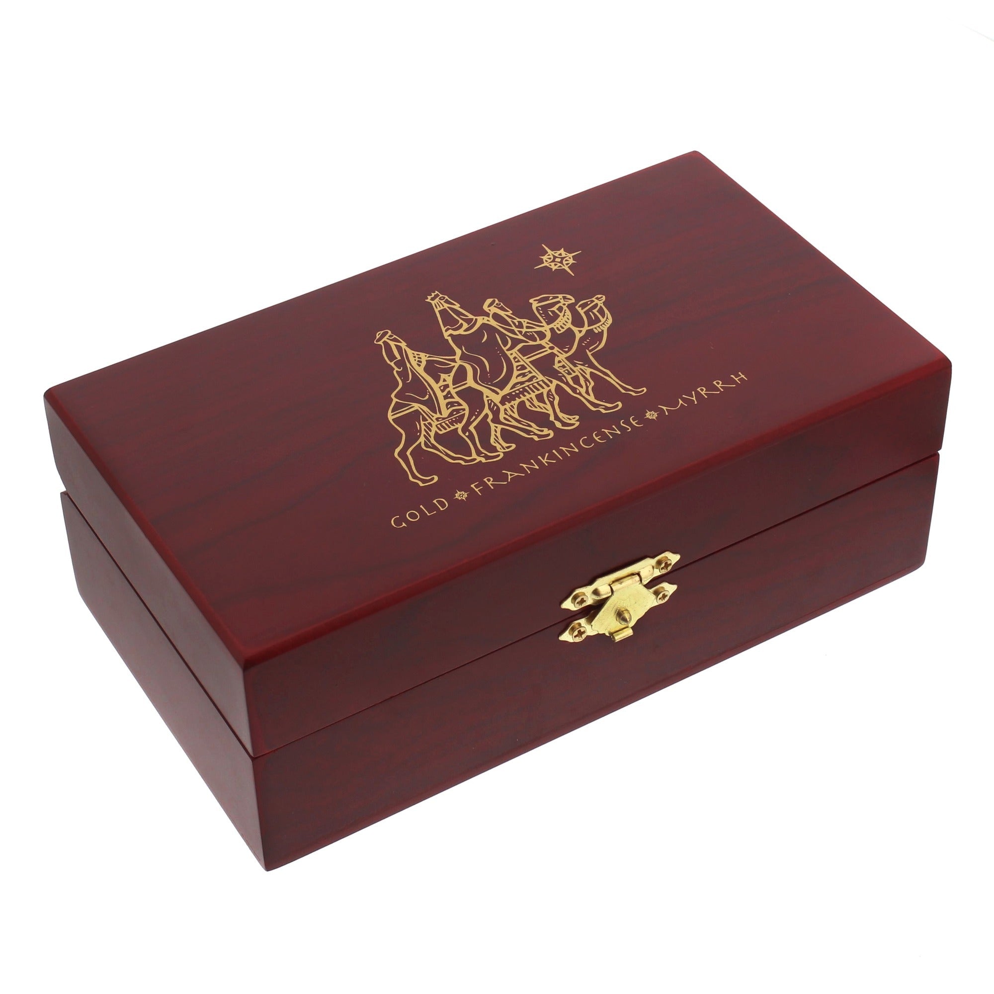 The silhouette of the Magi following the Christmas star – printed in gold – adorns the lid of this rich display box with dark stained high-gloss finish that is offset by the unique brass latch.