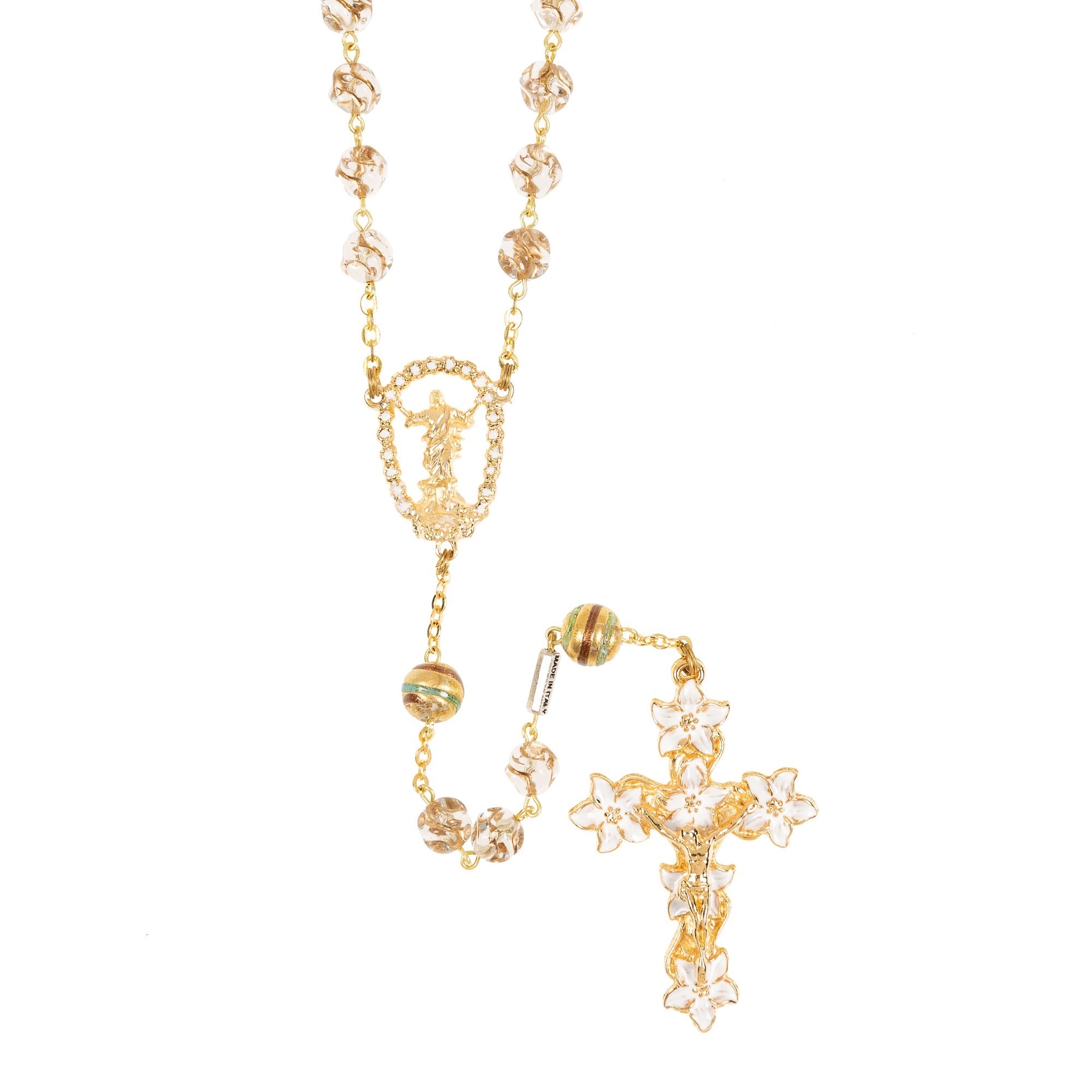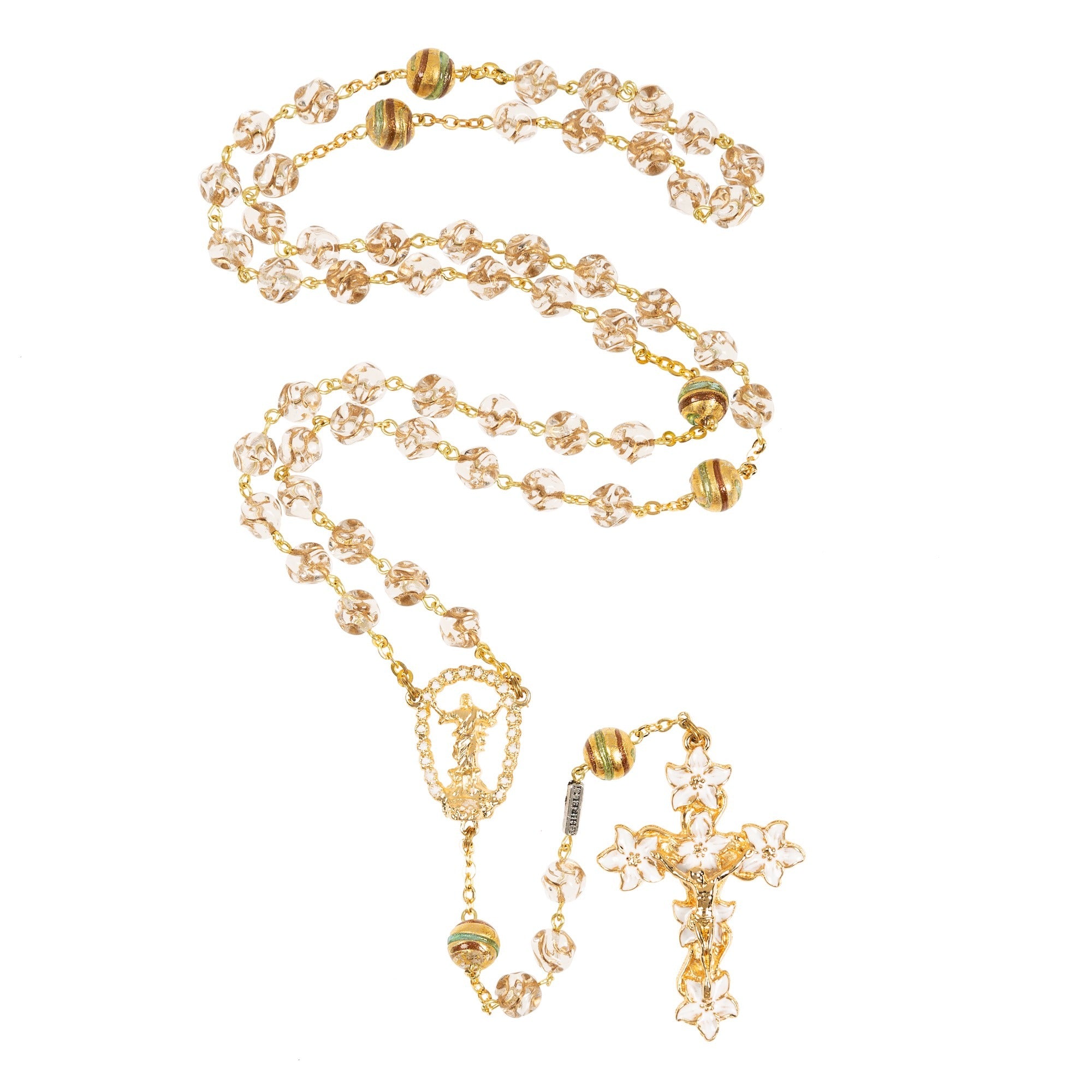 This stunning Italian rosary, from the renowned Ghirelli collection, makes a majestic devotional piece. Here we see twisted Bohemian glass beads uniquely accented with gold, joined at the center with a three dimensional miniature image of the Risen Christ. The Easter lily crucifix, with bright white enameling against a golden backing, is magnificent to behold. A truly majestic piece to aid your prayer during the Easter season and beyond.