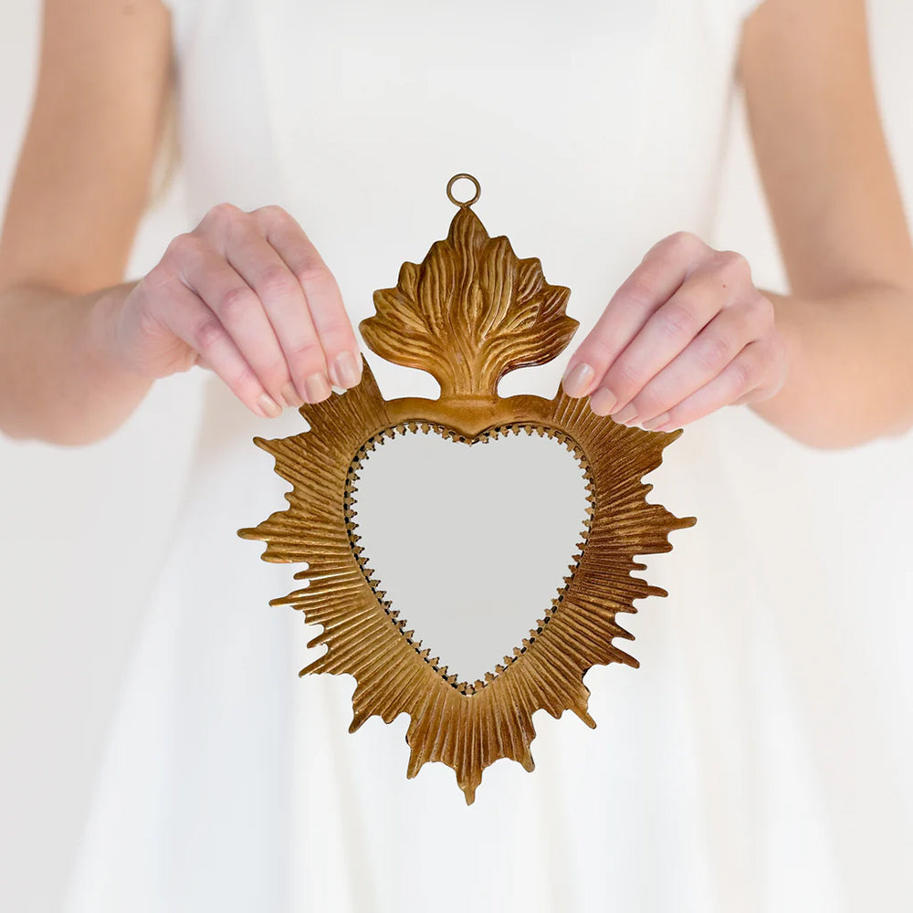 The Gold Sacred Heart Mirror beautifully honors the Sacred Heart of Jesus with its intricately designed, heart-shaped center and metal accents symbolizing His divine love. This 10" antique gold mirror features a unique natural patina and serves as inspiring decor for walls or home altars. It's a perfect gift of faith, celebrating a beloved Church devotion.