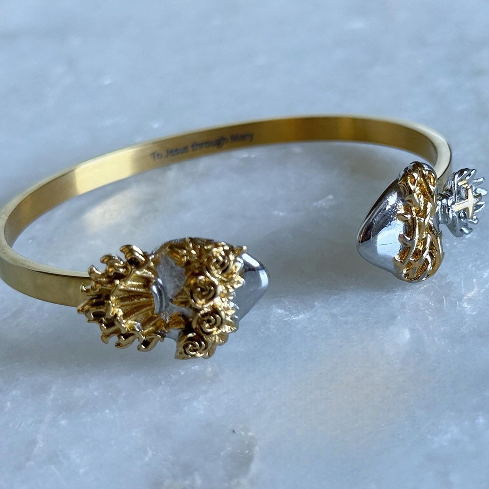The Gold & Silver Holy Hearts Bracelet is an elegant bangle that beautifully embodies faith and devotion. Featuring golden and silver accents of the Sacred and Immaculate Hearts, with intricate detailing like gold-accented thorns and roses. Crafted in hypoallergenic, waterproof 18 KT gold plating, it ensures lasting elegance. Featuring an engraved message "To Jesus, through Mary," it's a heartfelt gift made in the USA.