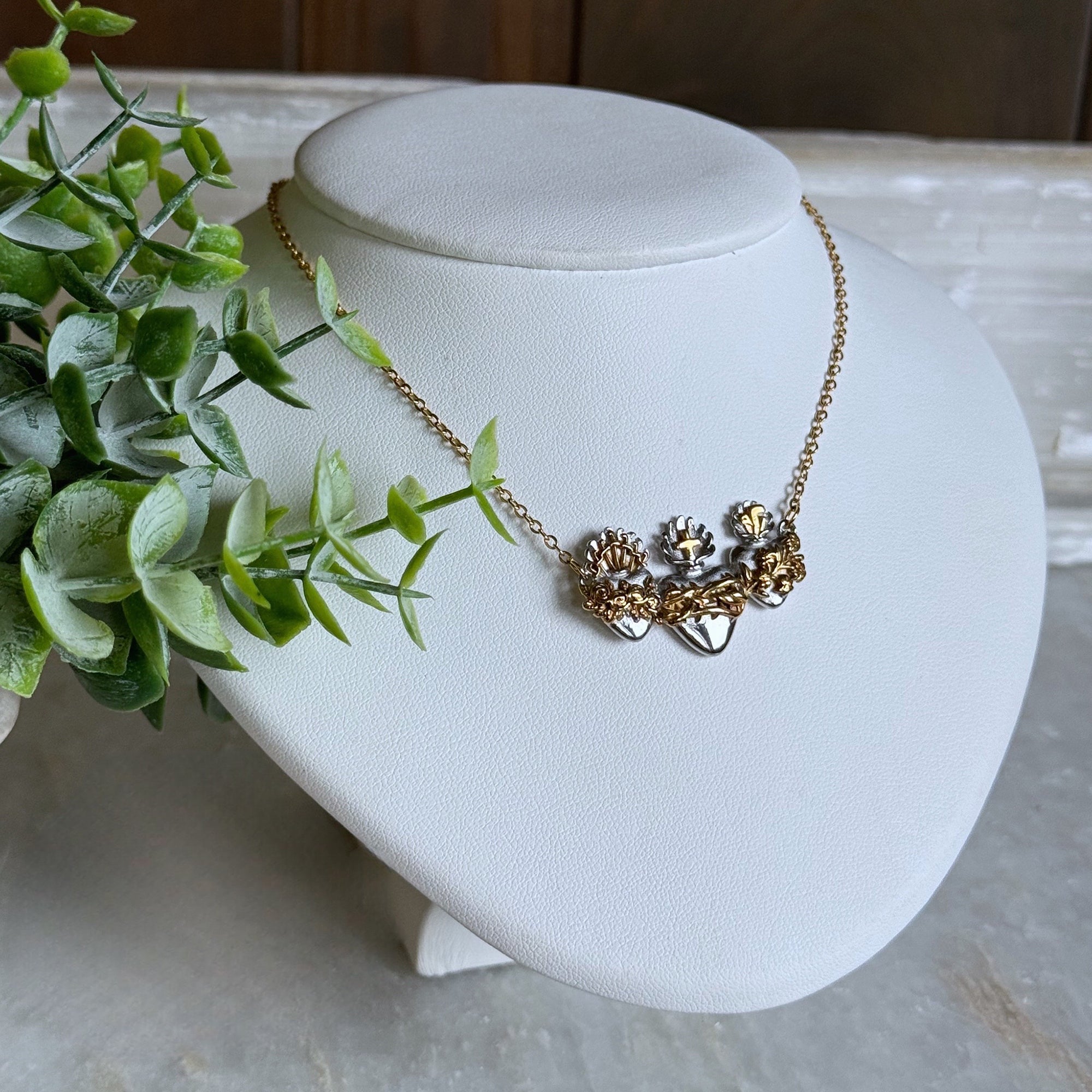 The Gold & Silver Holy Hearts Necklace is a graceful addition to any jewelry collection, featuring intricate gold detailing on silver hearts that honor the Sacred, Immaculate, and Chaste Hearts of Jesus, Mary, and Joseph. Elegantly hung on an 18" gold chain with a 2" extender, this hypoallergenic, nickel-free piece makes a meaningful gift. Comes in a deluxe gift box and is made in the USA.