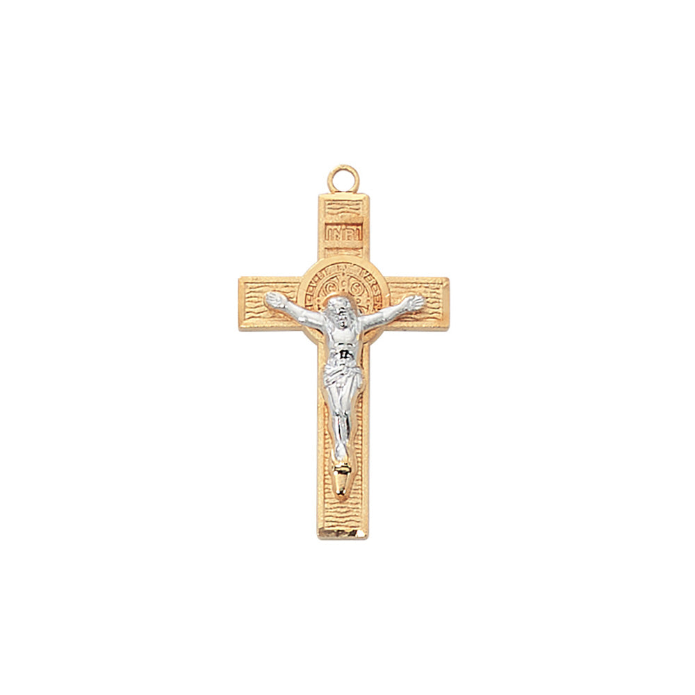 The Gold & Sterling Crucifix Necklace showcases a stunning two-tone design with a gold cross, silver crucifix, and intricate detailing like wood grain designs and a St. Benedict medal imprint. It includes an 18" rhodium-plated chain and comes in a gift box, making it an elegant devotional gift for all ages. The 1.5" cross features a silver-plated corpus, adding to its breathtaking appeal.