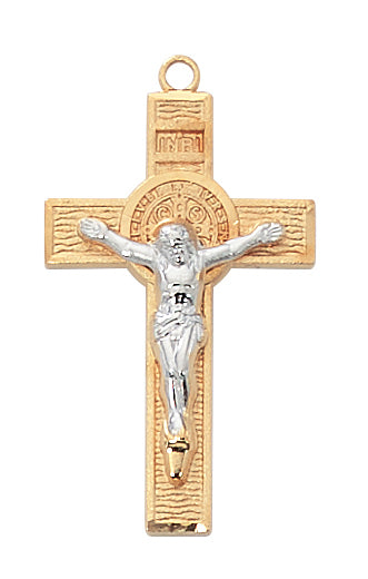 This breathtaking two tone crucifix features a gold cross with a silver crucifix and an 18" chain. The detailing is exquisite, with wood grain designs and a St. Benedict medal imprint. Makes a lovely gift of faith for any age.