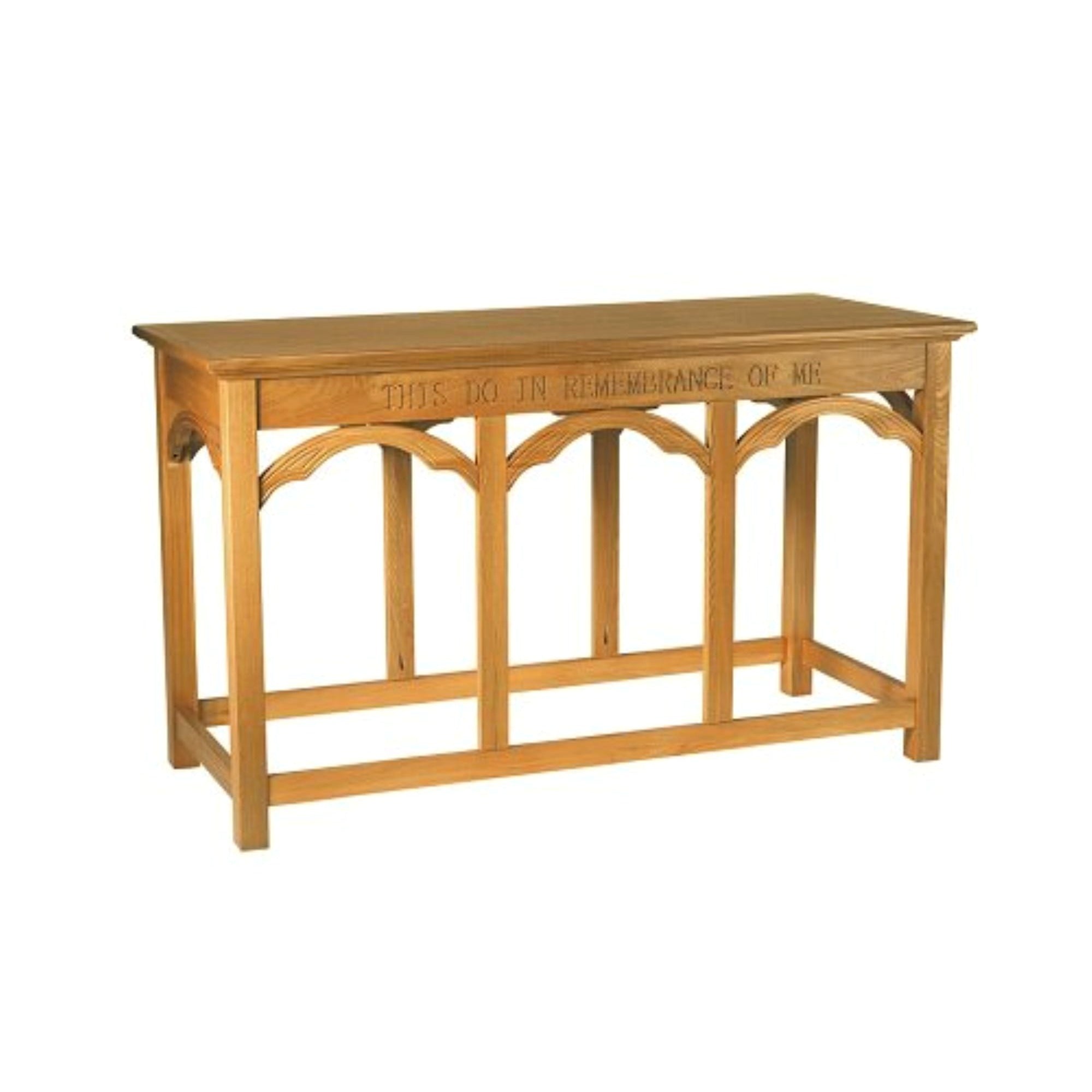 This Communion table made of solid maple with a light and subtle finish is designed with simple elegance in mind. Accented on the front with woodworking reminiscent of Gothic arches. Carved lettering on the front of the table reads, "This Do In Remembrance of Me." A lovely Communion table for your chapel, school, retreat center, or other worship space.