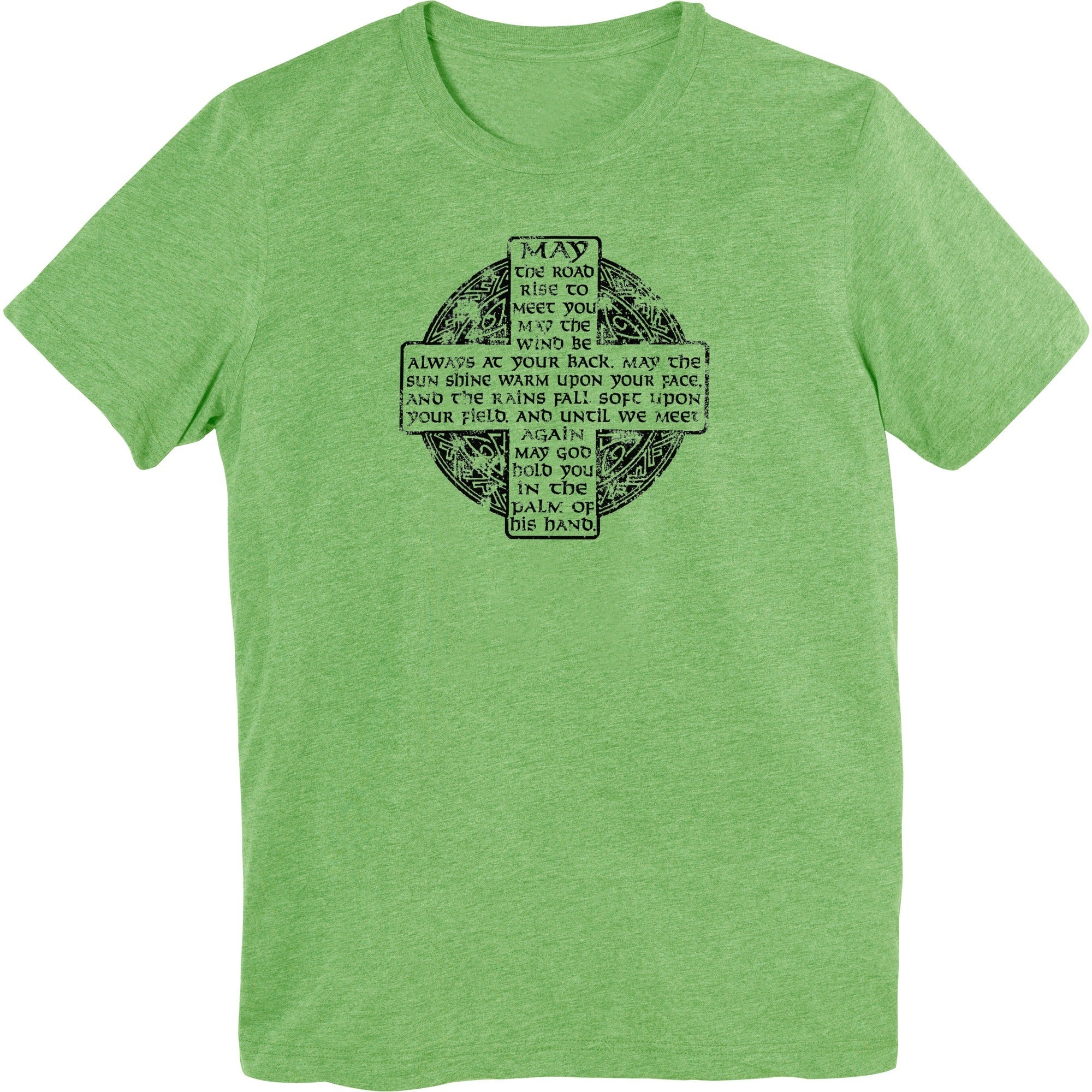 The Green Irish Blessing T-Shirt is a comfy, tri-blend tee featuring a vintage Celtic cross design. Celebrating one of the greatest Irish blessings, it conveys a powerful message of divine guidance. With its modern fit and distressed style, this short-sleeve shirt is available in sizes S-3XL, making it a stylish addition to any wardrobe.