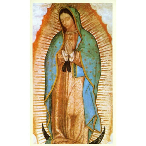 This prayer card features the popular image of Our Lady of Guadalupe with a white background. Made in the USA. Cards are micro-perforated.
