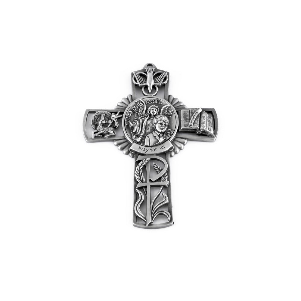 The Guardian Angel Boy Wall Cross from the Bethany Collection is a fine pewter piece measuring 5 inches. It comes accompanied by a prayer card in a 6" x 4" x 1" box. Proudly made in the USA, this cross is a meaningful addition to any space, perfect for those seeking protection and divine guidance.