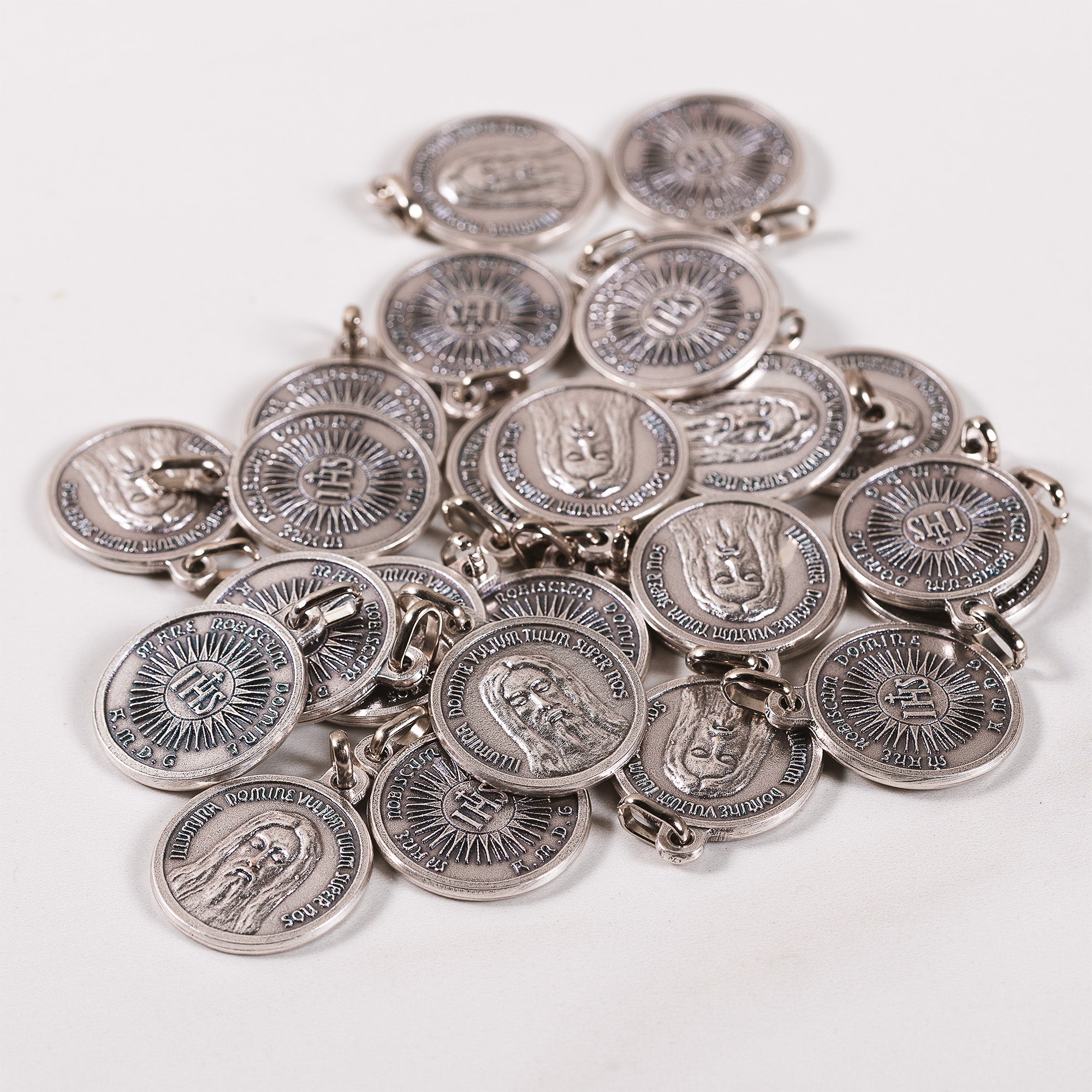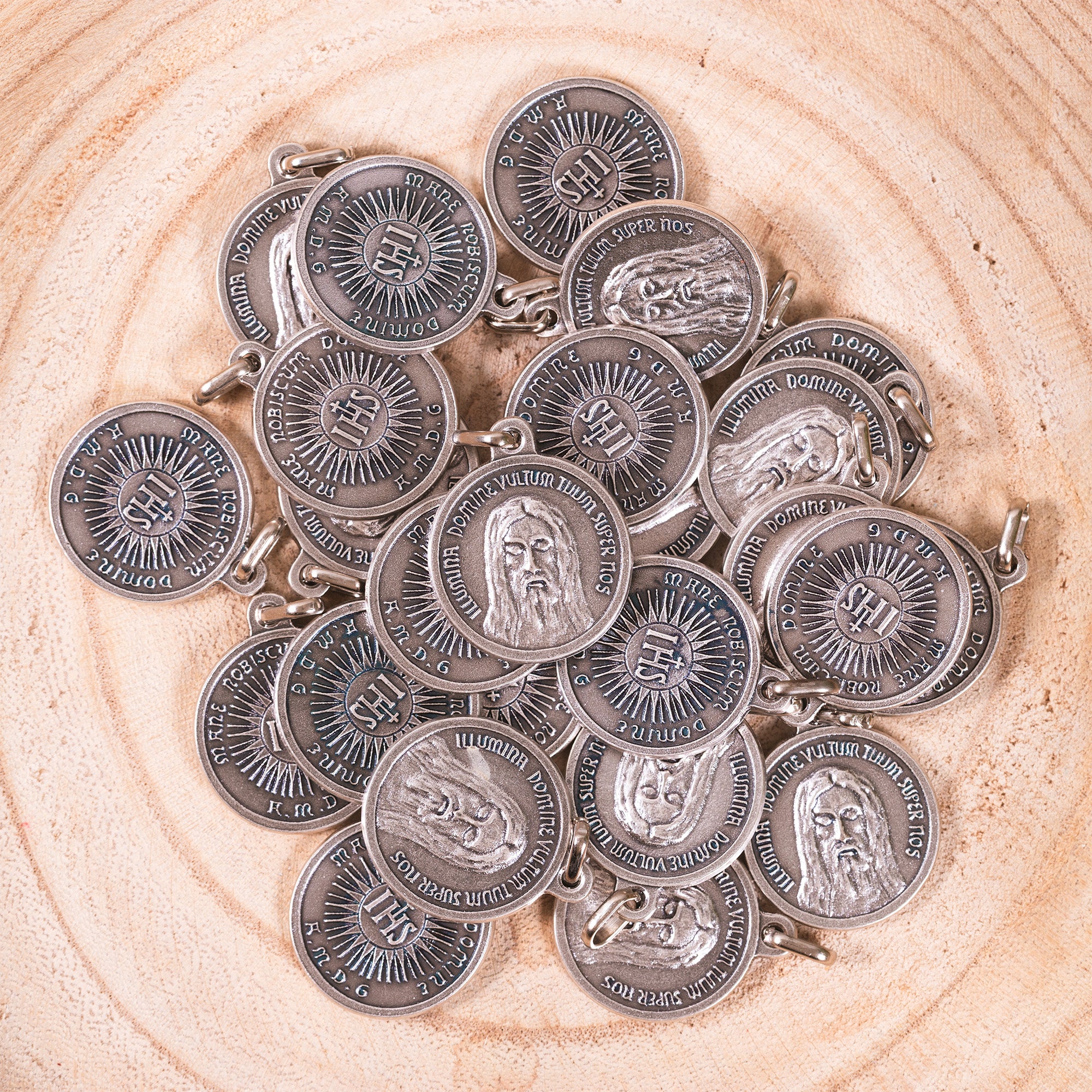 This bulk package of 25 Holy Face Medals is perfect for promoting devotion to the Holy Face of Jesus. Each oxidized silver medal features the Lord's face and the IHS Christogram on reverse. Measuring 0.98 inches, these medals are ideal for sharing with friends, family, parish, and prayer groups. Made in Italy, these medals contribute to a meaningful expression of faith.