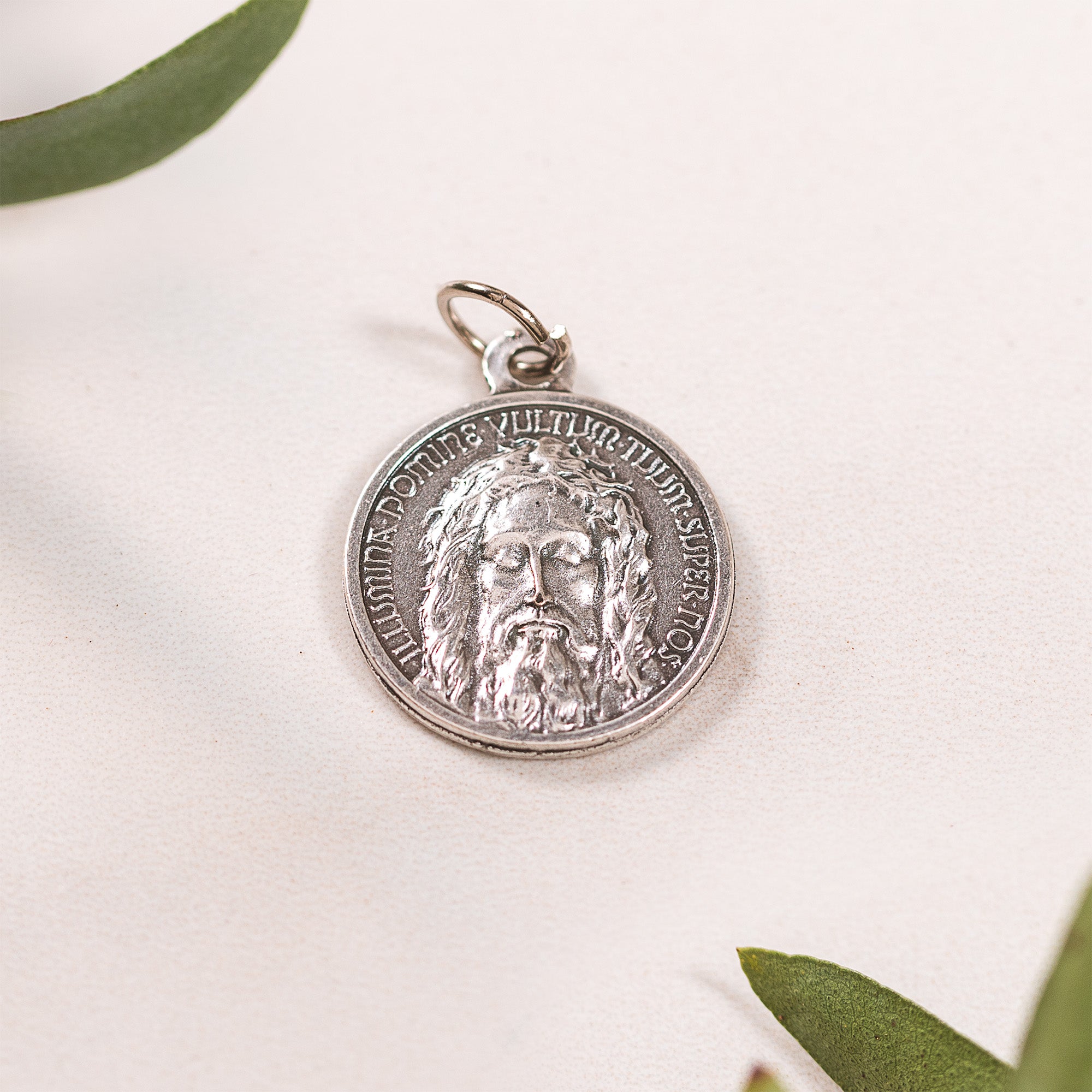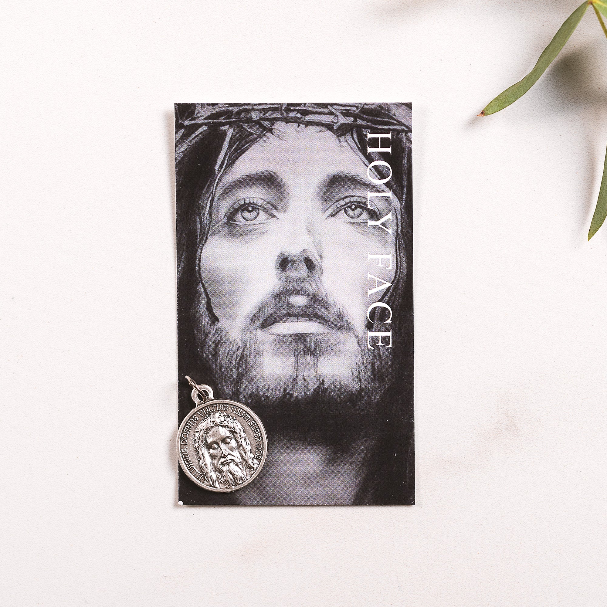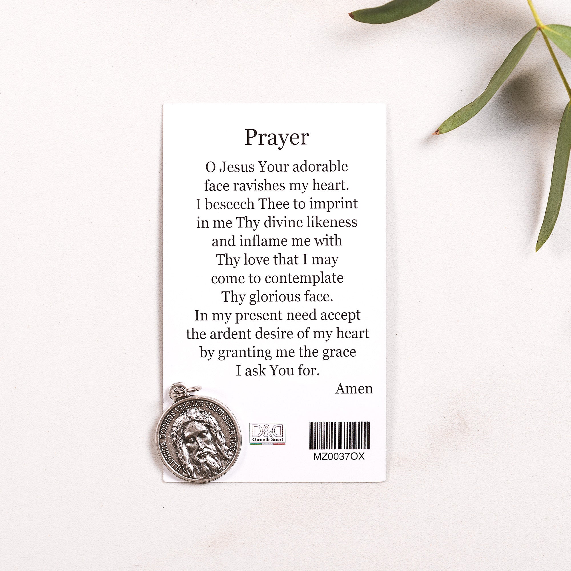 The Holy Face Prayer Card & Medal set features a beautifully crafted black and white artwork of the Holy Face on one side of the card and a prayer on the reverse, paired with an oxidized silver Holy Face medal. This elegant devotional gift is made in Italy, making it a meaningful and memorable keepsake for spiritual reflection. Cards measure 3.15" x 1.97"; medal, .78" diameter.