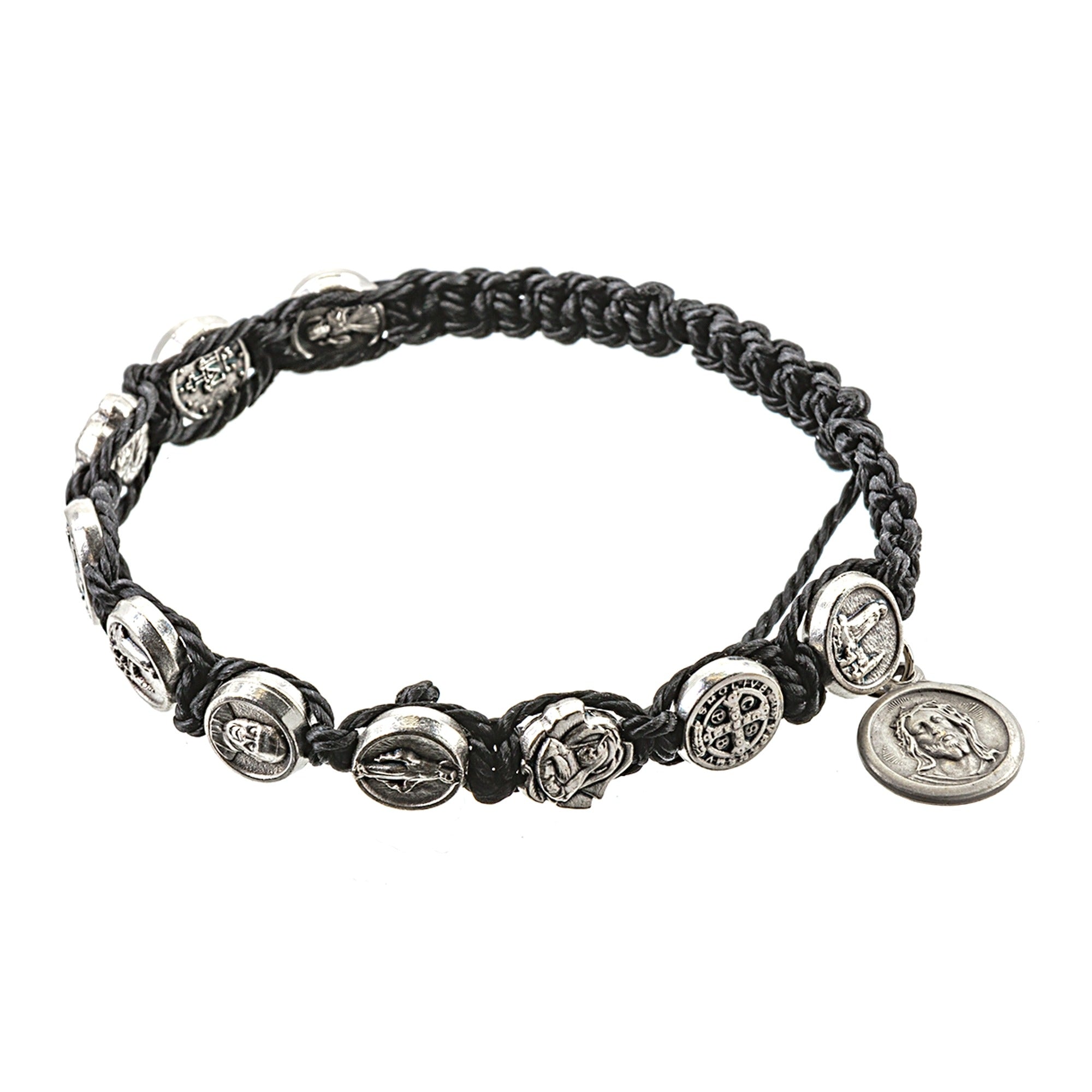 This black macramé rosary bracelet is a youthful and fitting way to honor Jesus and the saints. Miniature saint medals are woven into the knotted cording, to serve as the rosary "beads,"  adding a unique and prayerful touch. There are two each featuring St. Benedict, Our Lady of Grace, Padre Pio, St. Francis, and St. Therese.