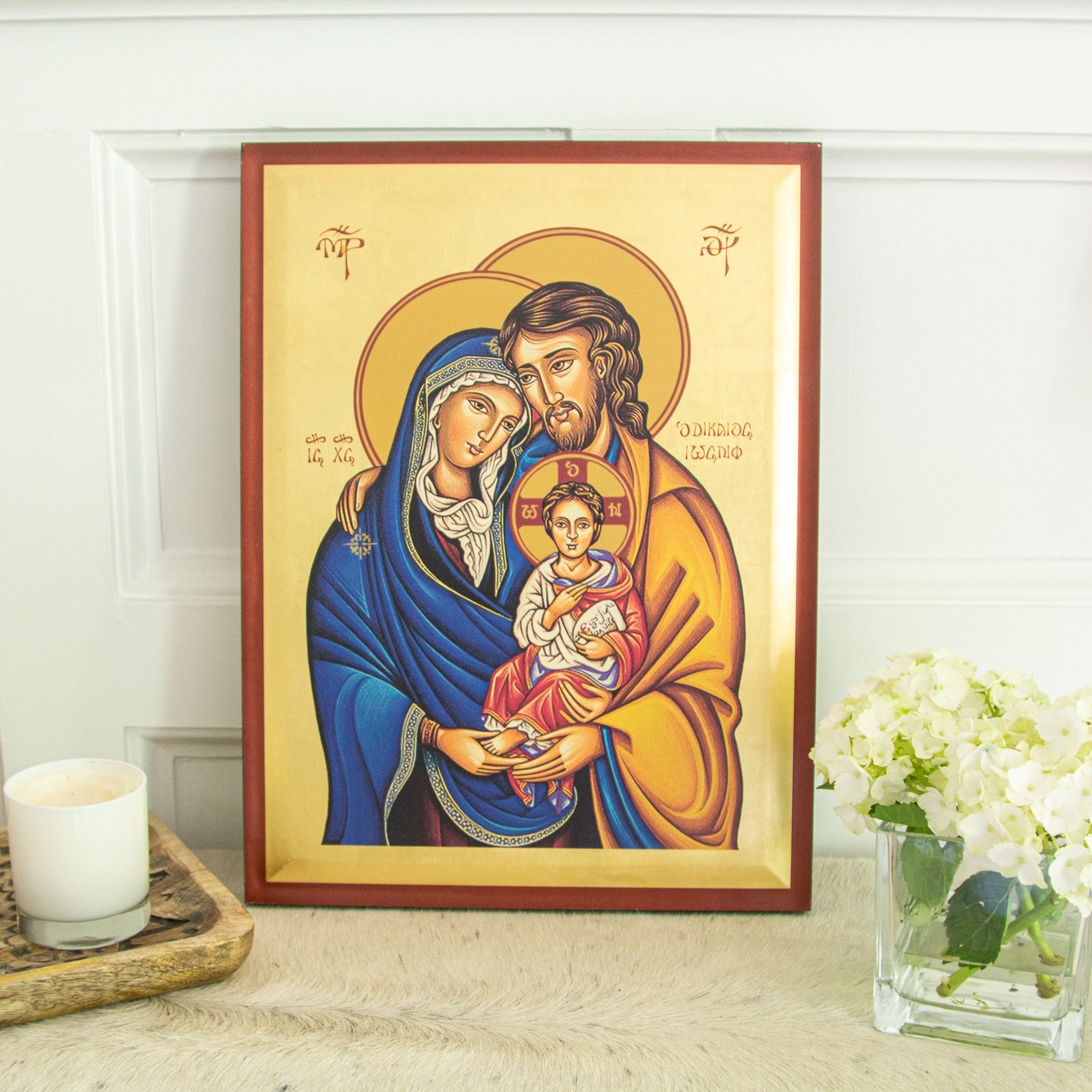 The Holy Family Large Greek Icon showcases Jesus, Mary, and Joseph in vibrant Byzantine colors, accented with gold leaf. Handcrafted by master artisans in Italy, this icon is a stunning expression of faith, blending tradition with artistry. Measuring 18.8" by 14", it offers a beautiful tribute to the Holy Family of Nazareth.