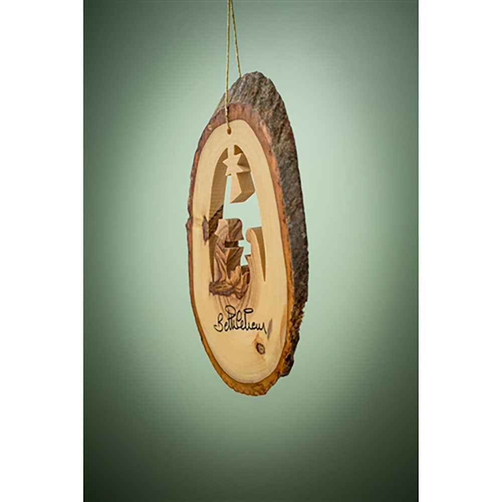 Enhance your Christmas décor with a hand-crafted Nativity ornament, cut from Holy Land olive wood. Created by a fourth-generation master carver in Bethlehem, each piece is unique, showcasing the natural bark and grain of pruned branches. A meaningful, symbolic gift that supports persecuted Christians, this ornament adds a heartfelt touch to your holiday season.