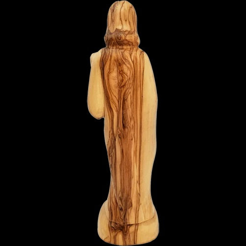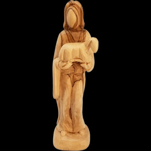 A statue of Jesus the Good Shepherd, hand crafted of warm, rich olive wood in beautiful tones, by Christians in the Holy Land of Bethlehem. It's a faithful and simply elegant addition to your décor that is distinctive and attractive. The beautiful, faceless design makes for a simple yet powerful statement.