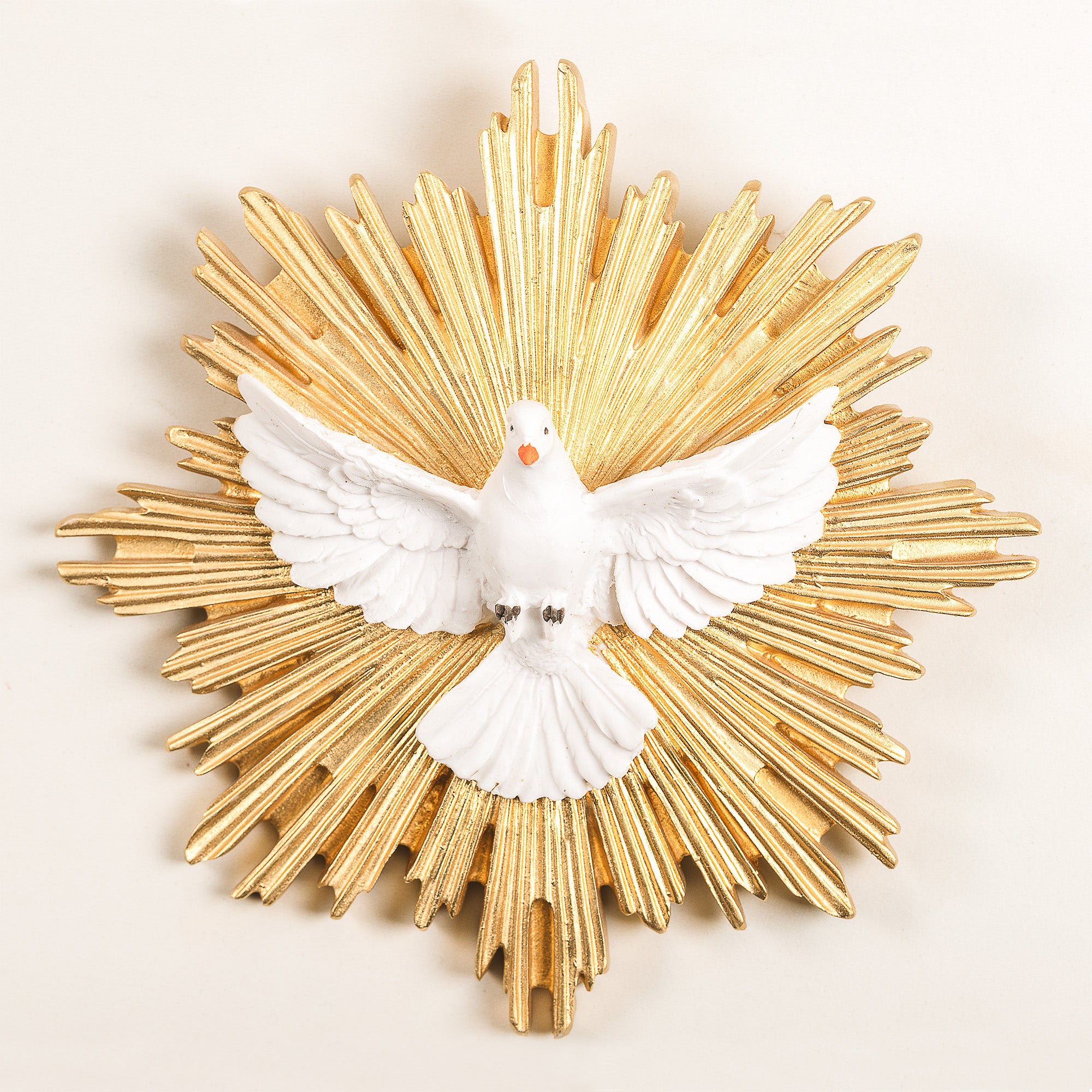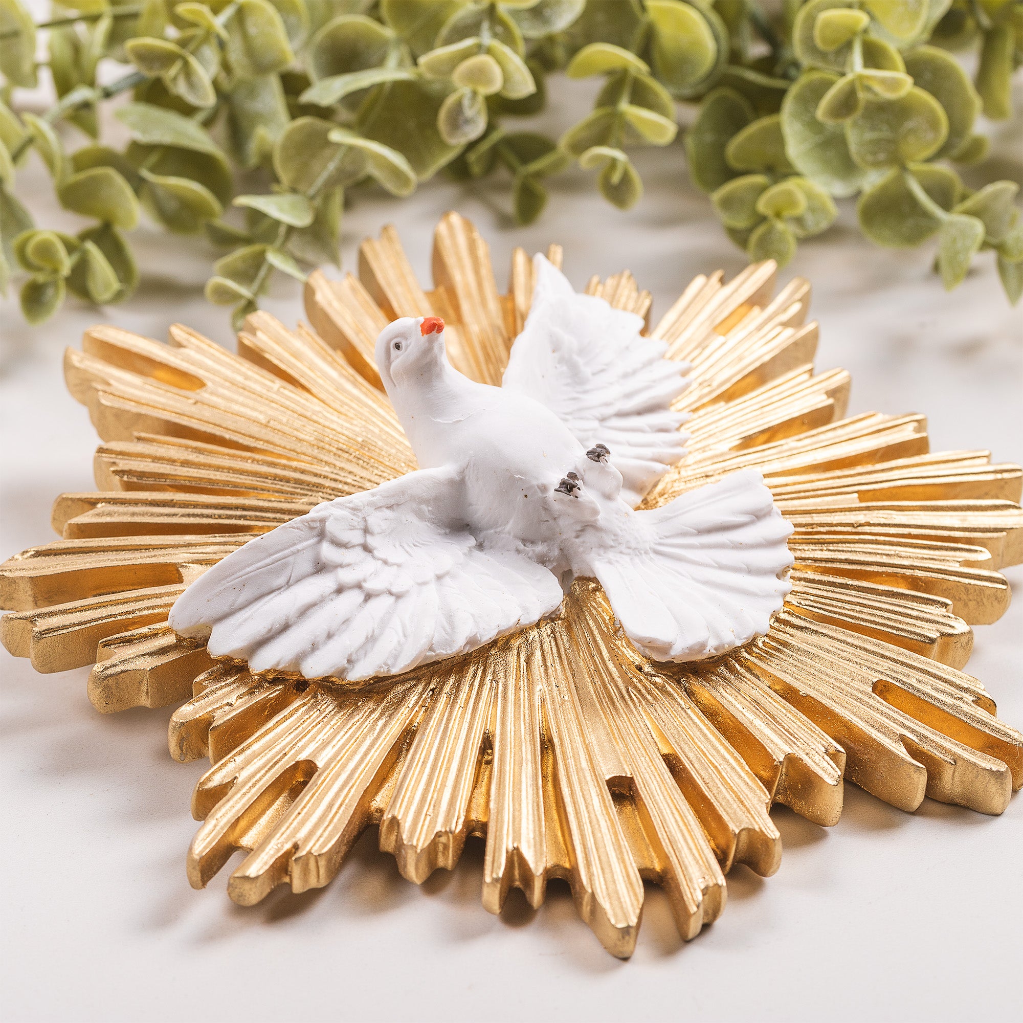 The handmade plaque features a background of cascading golden rays, and the Dove of the Holy Spirit in pristine white. Invite Him into your Catholic home or sacred space. Come, Holy Spirit, and fill this space with your seven-fold gifts and the wonders of God's love. Made in Italy.