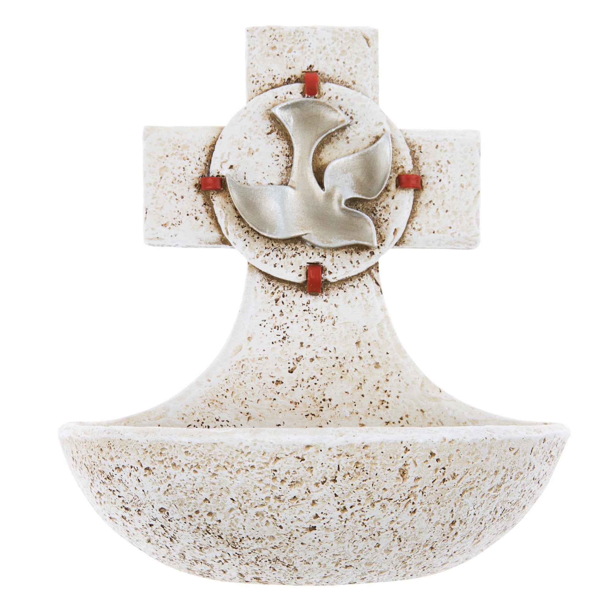 The Holy Spirit Holy Water Font features a rustic design with a dove motif, perfect for spiritual reflection. Ideal for placement by a front door or bedroom, it encourages daily blessings and serves as a cherished Confirmation gift. Measuring 5"H x 4.5"W, this wall-mountable resin piece will be treasured for a lifetime.