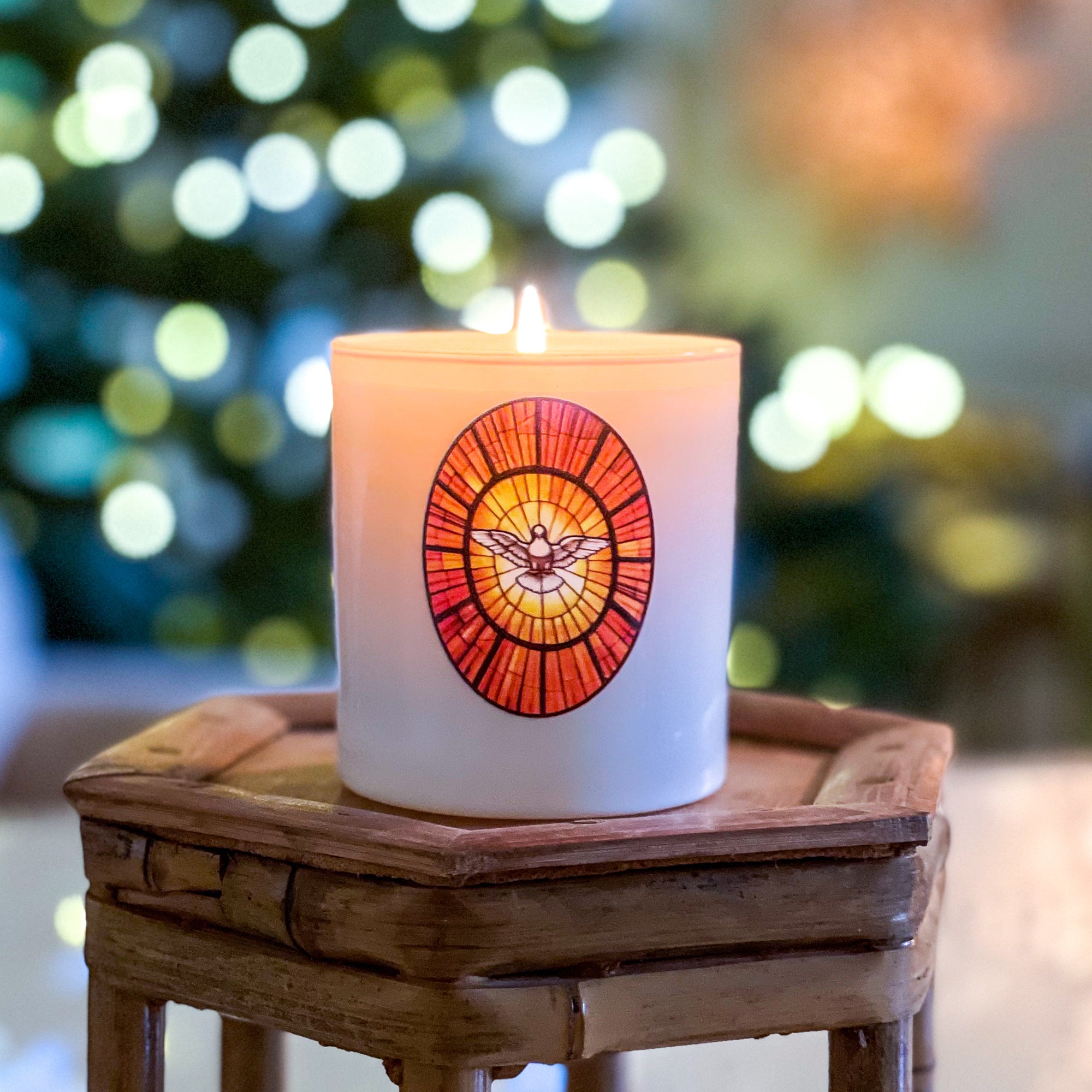 Illuminate your space with the Holy Spirit Stained Glass Window Candle, exclusive to The Catholic Company. This 11 oz. candle, inspired by St. Peter's Basilica, offers a refreshing Cotton Clean scent with powder and musk undertones. Made from vegan soy coconut blend wax, it burns for 90 hours, making it a thoughtful and inspiring gift that adds a sacred touch to your home.
