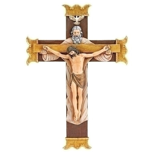 A powerful visual of the mystery of the Holy Trinity, this crucifix depicts God the Father, God the Son, and God the Holy Spirit, all supporting one another. A beautiful crucifix to display as a reminder of this central profession of Christian faith.