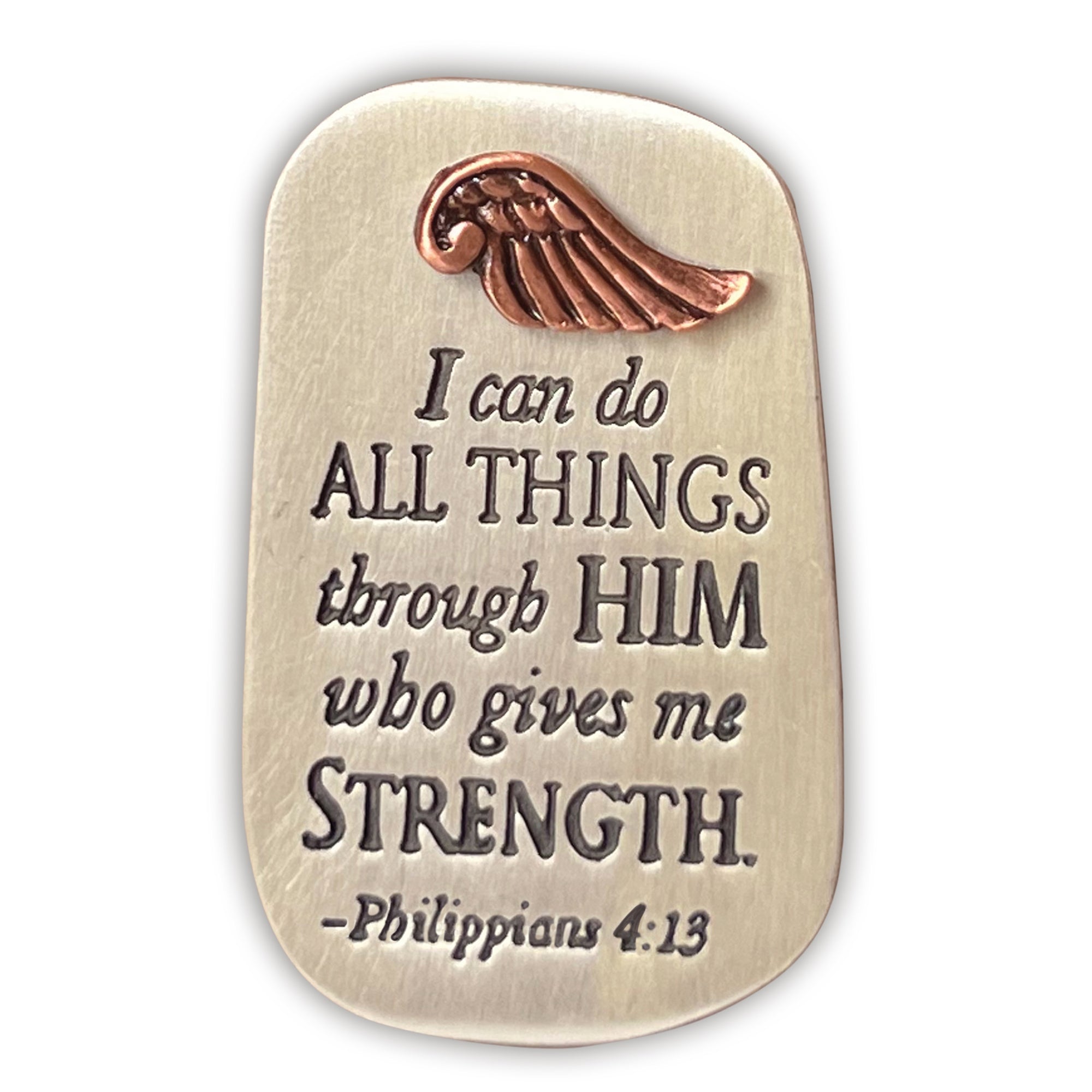 Carry a daily reminder of strength and protection wherever you go with this beautiful "I Can Do All Things" visor clip. Finished in silver with a cast metal angel wing accented in gold, it features the beloved Scripture verse from Philippians 4:13: