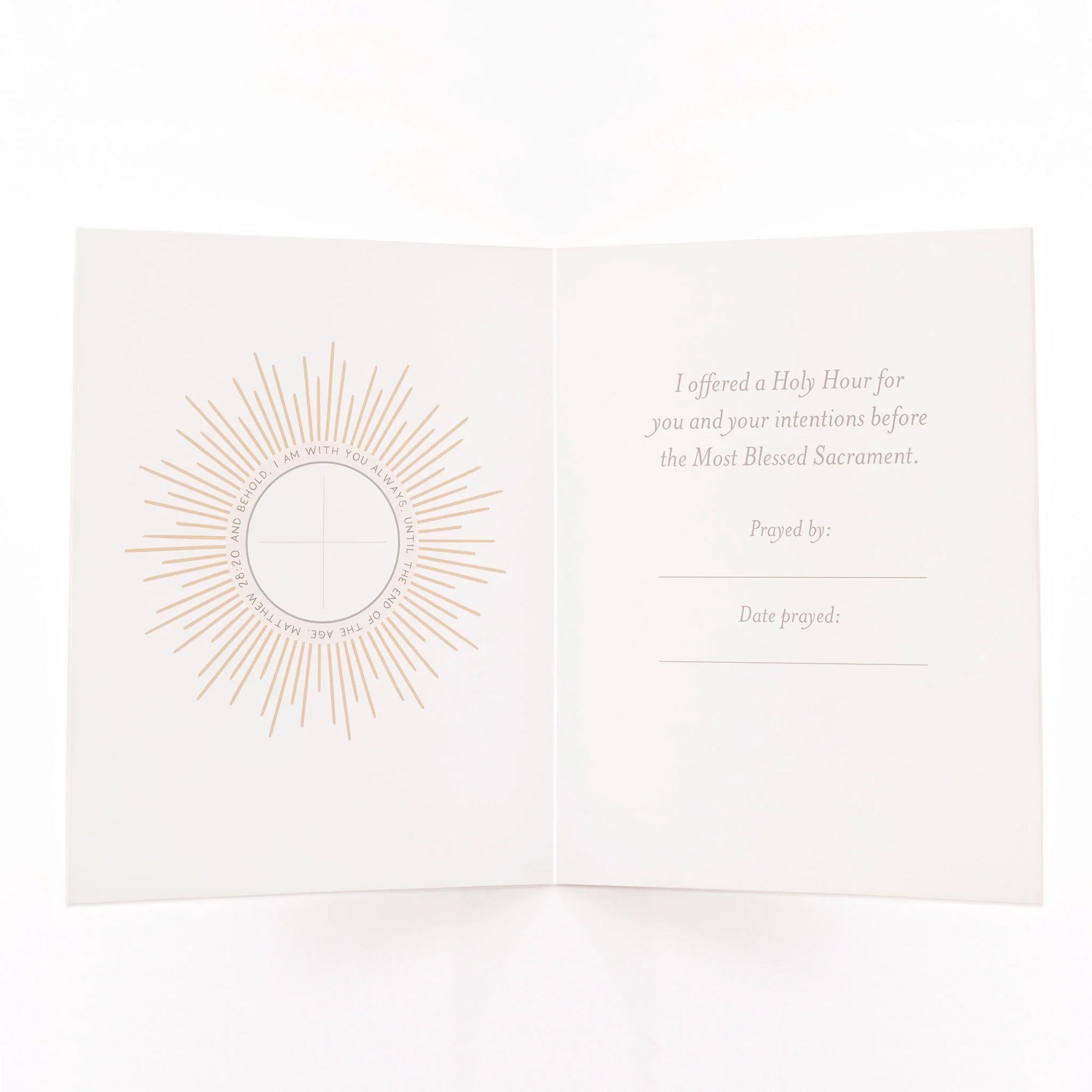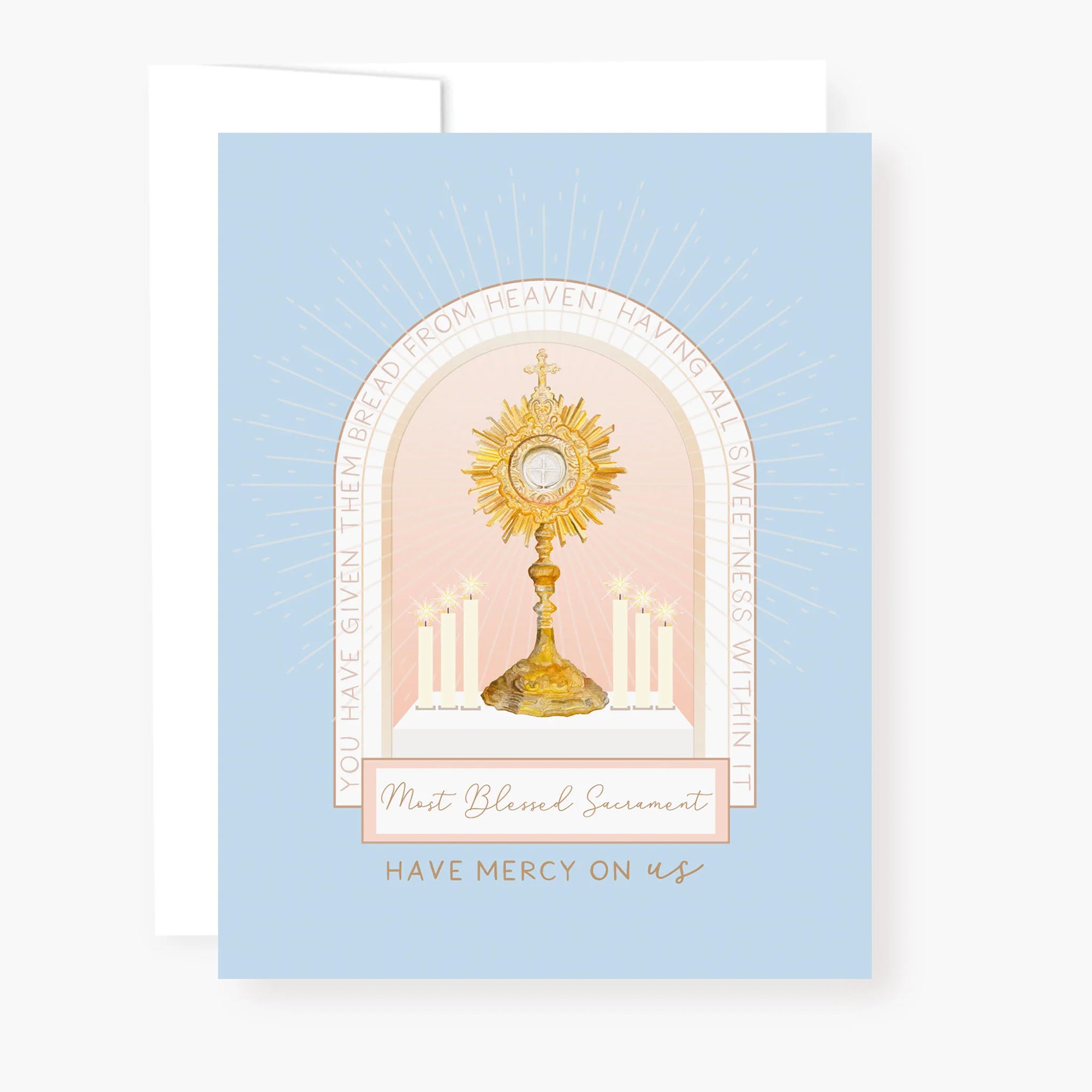 The watercolor image features the Blessed Sacrament surrounded by candles set for Eucharistic Adoration. The phrase, "You have given them Bread from heaven, having all sweetness within it", from the Benediction during Eucharistic adoration, surrounds the image. The inside artwork contains the Eucharist with the words of the promise of Christ to remain with us until the end of the age (Matthew 28:20).