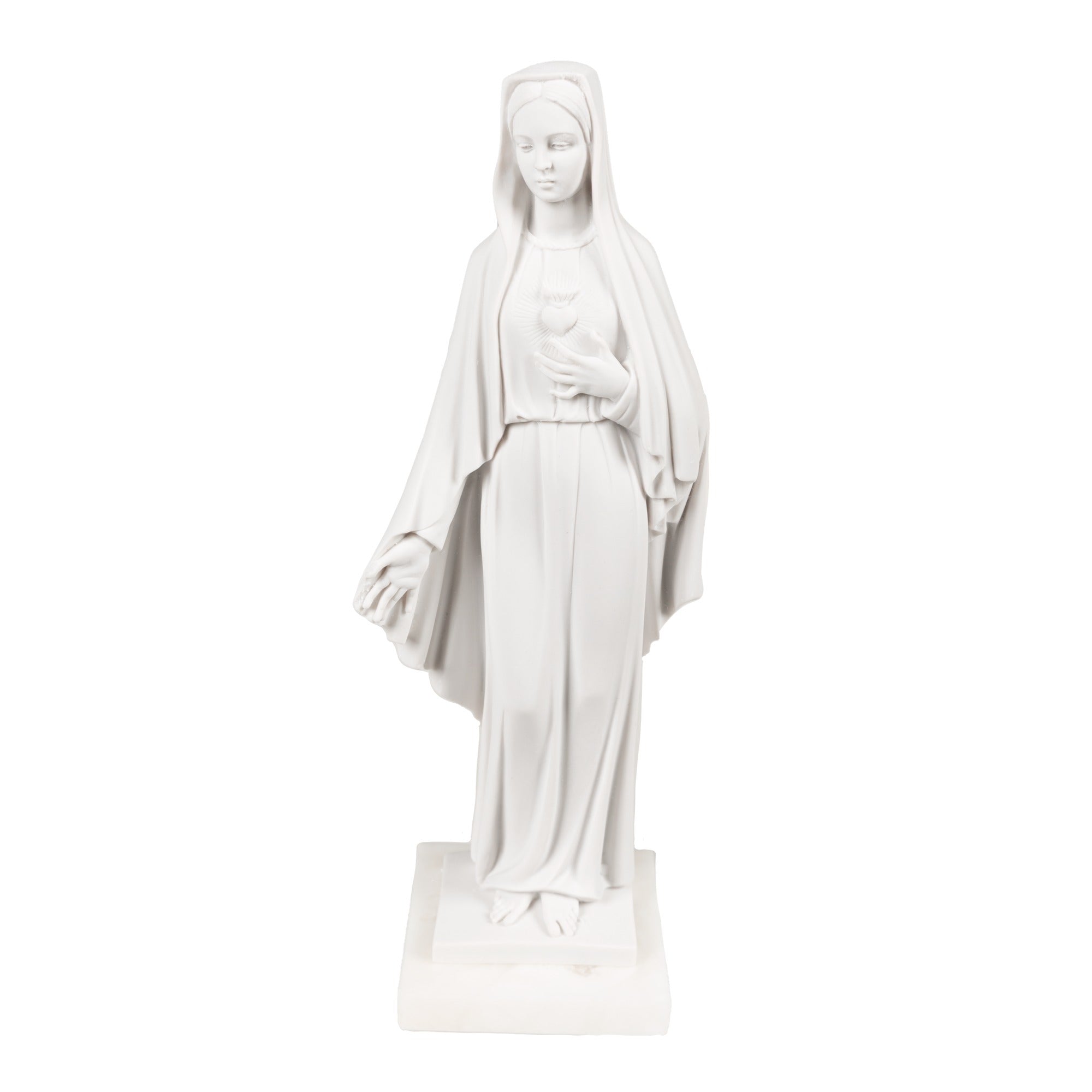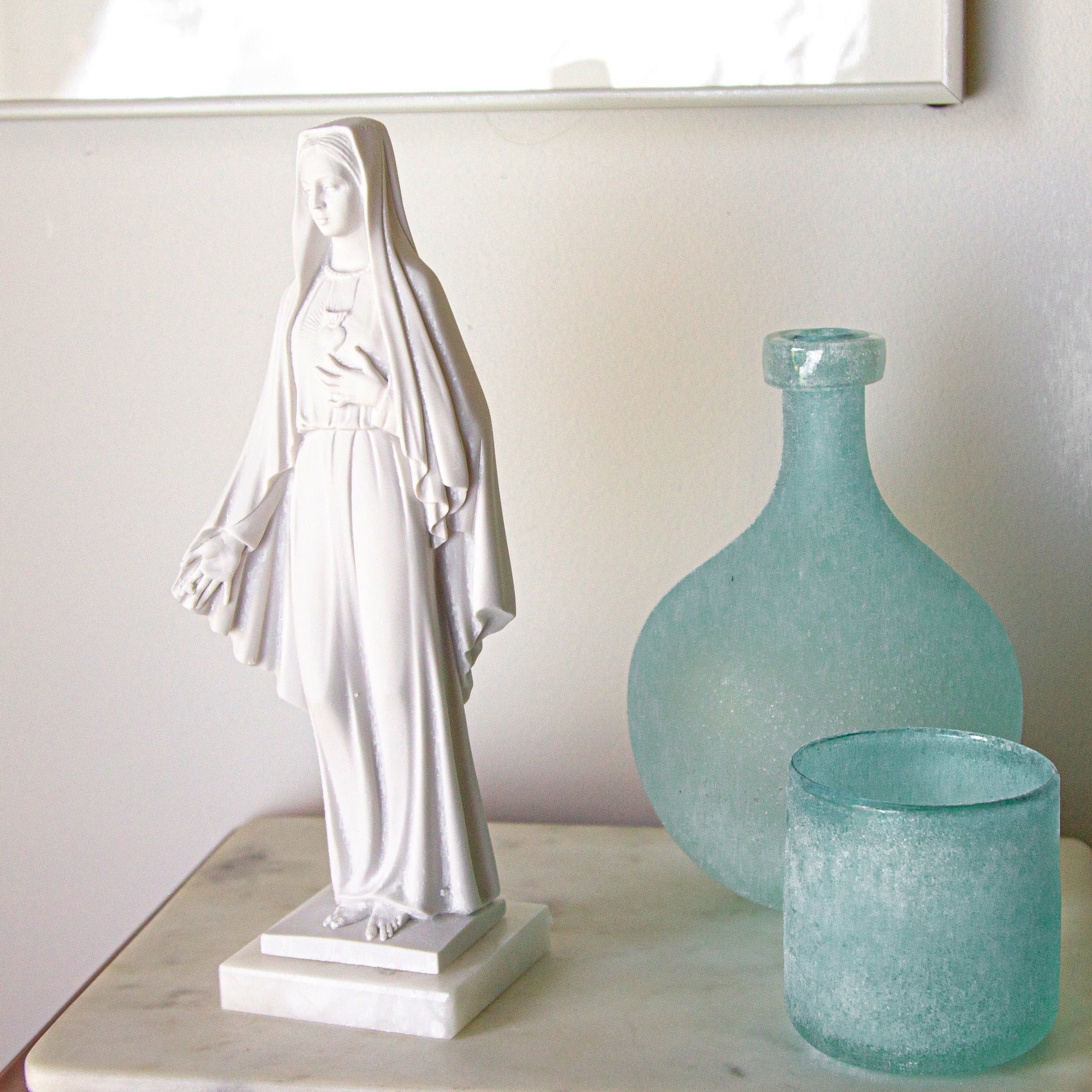 This gorgeous statue of the Immaculate Heart is made in Italy of white alabaster, on a white base. Mary's eyes are cast down in humility, her hand resting on her heart, filled with love for all mankind. Graceful lines, fine detail and Italian craftsmanship. Display this lovely statue at home in honor of our Mother and allow it to inspire you during times of prayer and meditation. A beautiful gift for anyone who loves Our Lady.