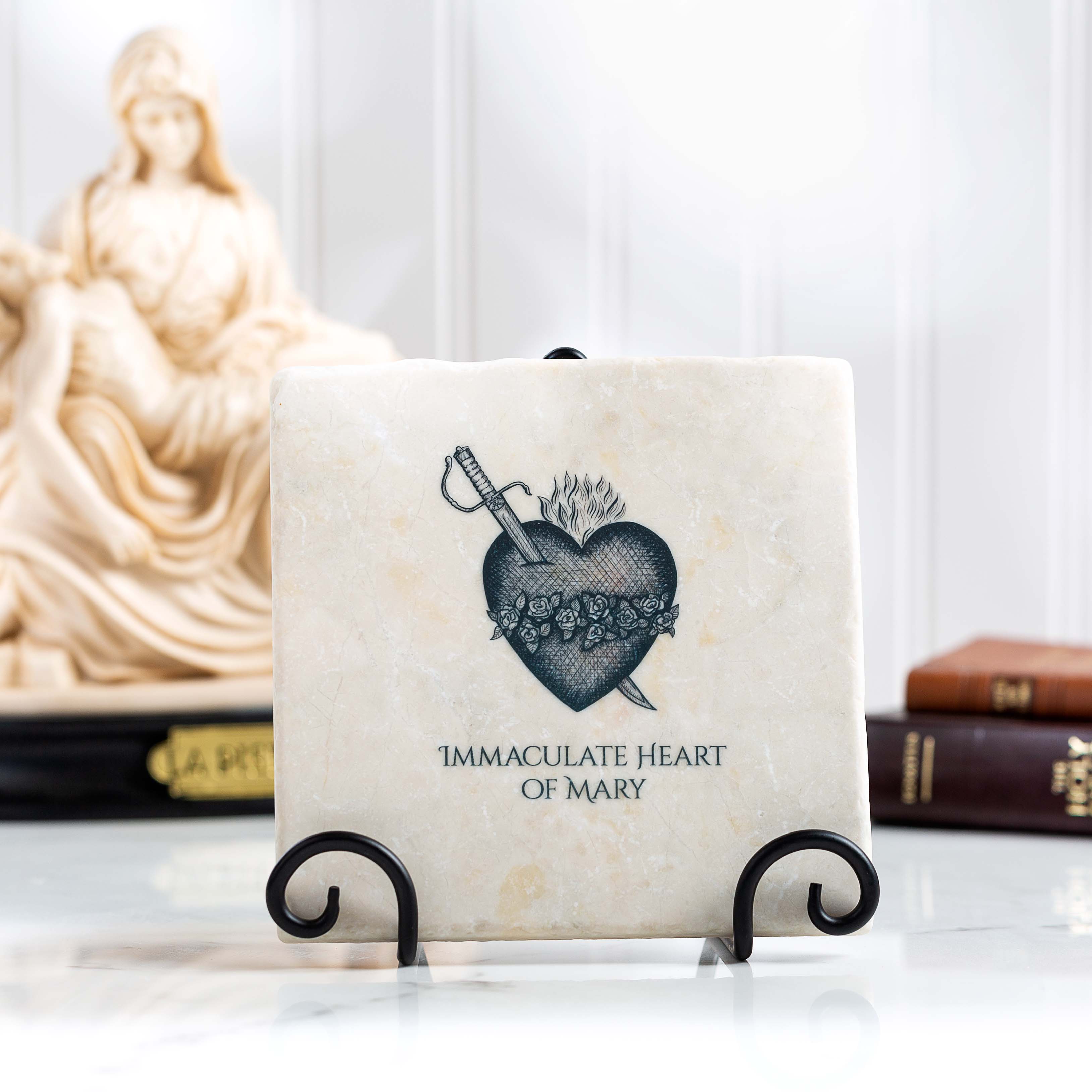 The Immaculate Heart of Mary Tumbled Stone Tile elegantly honors Our Blessed Mother's Immaculate Heart, symbolizing purity and love. Exclusively designed by The Catholic Company in North Carolina, it can be used as a trivet or standing plaque. With its unique drawing and no-slip rubber feet, it makes a thoughtful gift for devotees. Easel sold separately.